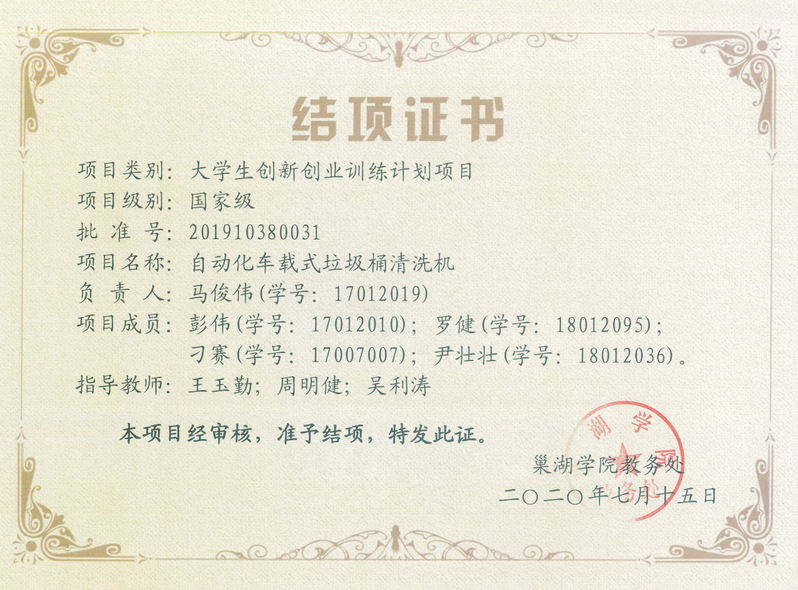 国家级大学生创新创业计划训练 ——自动化车载式垃圾桶清洗机 2020.07.15