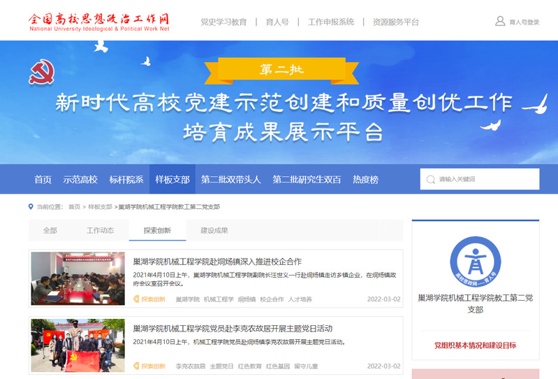 2019年,机械工程学院党委入选校级“党建工作标杆院系”培育创建单位,教工第二党支部先后入选首批“安徽省党建工作样板支部”和第二批“全国党建工作样板支部”培育创建单位。2020年学院机械设计制造及其自动化教研室喜获“安徽省工人先锋号”称号。扎实的党建工作为学院整体发展奠定了坚实的基础。