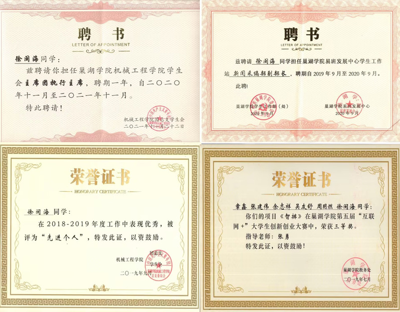 刚开始进入大学的时候,脱离了高中阶段的那种氛围,有点不太适应,心中想找一点事情做做,充实一下自己,所以徐闽海选择加入学生组织。大一上学期他很荣幸地加入了校级学生组织awc777万象城娱乐官网易班发展中心和院级学生组织机械工程学院学生会,并且在易班发展中心任职两年,在学院学生会任职三年,在此期间,徐闽海积极参与各项活动,服务同学,努力提升自己。正是因为在学生组织的这几年经历,培养了他的团队合作意识、管理能力、组织能力和沟通能力,使自己的大学生活充实而又有意义。