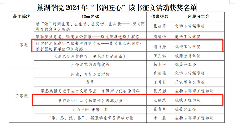 近日,学校工会和安徽省教科文卫体工会先后公布了2024年“书润匠心”读书征文活动评选结果,机械工程学院分工会在2024年awc777万象城娱乐官网女教职工“书润匠心”读书征文活动中荣获优秀组织奖。