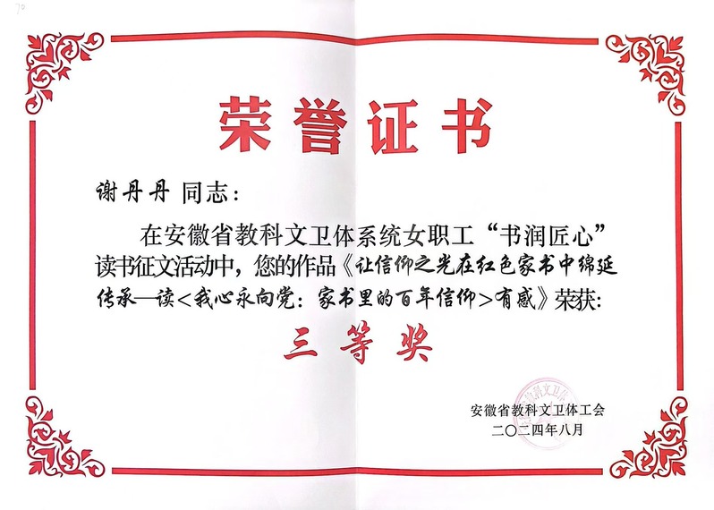 学院谢丹丹老师的作品《让信仰之光在红色家书中绵延传承——读<我心永向党:家书里的百年信仰>有感》获学校一等奖,汪缤缤老师的作品《书香润心:从<杨绛传>汲取力量》获三等奖。谢丹丹老师的作品还同时喜获“省教科文卫体系统女职工‘书润匠心’读书征文活动”三等奖。