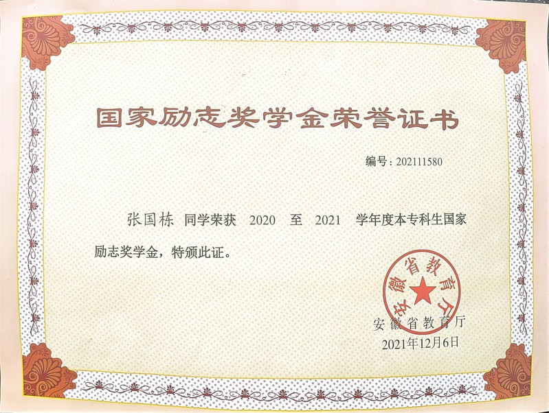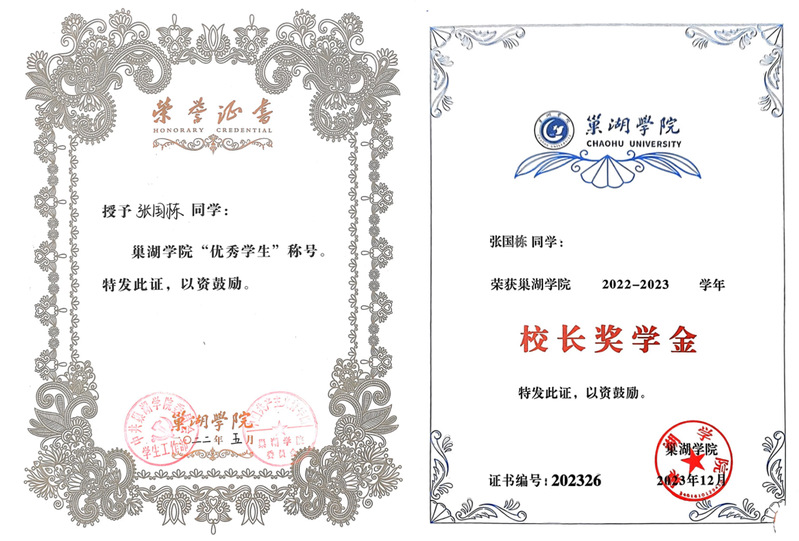 在校期间,积极参加学校举办的各类活动,曾获2021年国家励志奖学金,2022年国家励志奖学金,2023年校长奖学金;荣获“优秀学生”“优秀共青团员”、2024届“安徽省普通高等学校优秀毕业生”等荣誉称号。撰写发明专利1项,发表学术论文3篇、主持省级大学生创新创业项目1项,作为项目成员参与国家级大创项目1项、安徽省级大创项目1项,参与皖维科技孵化基金项目2项。