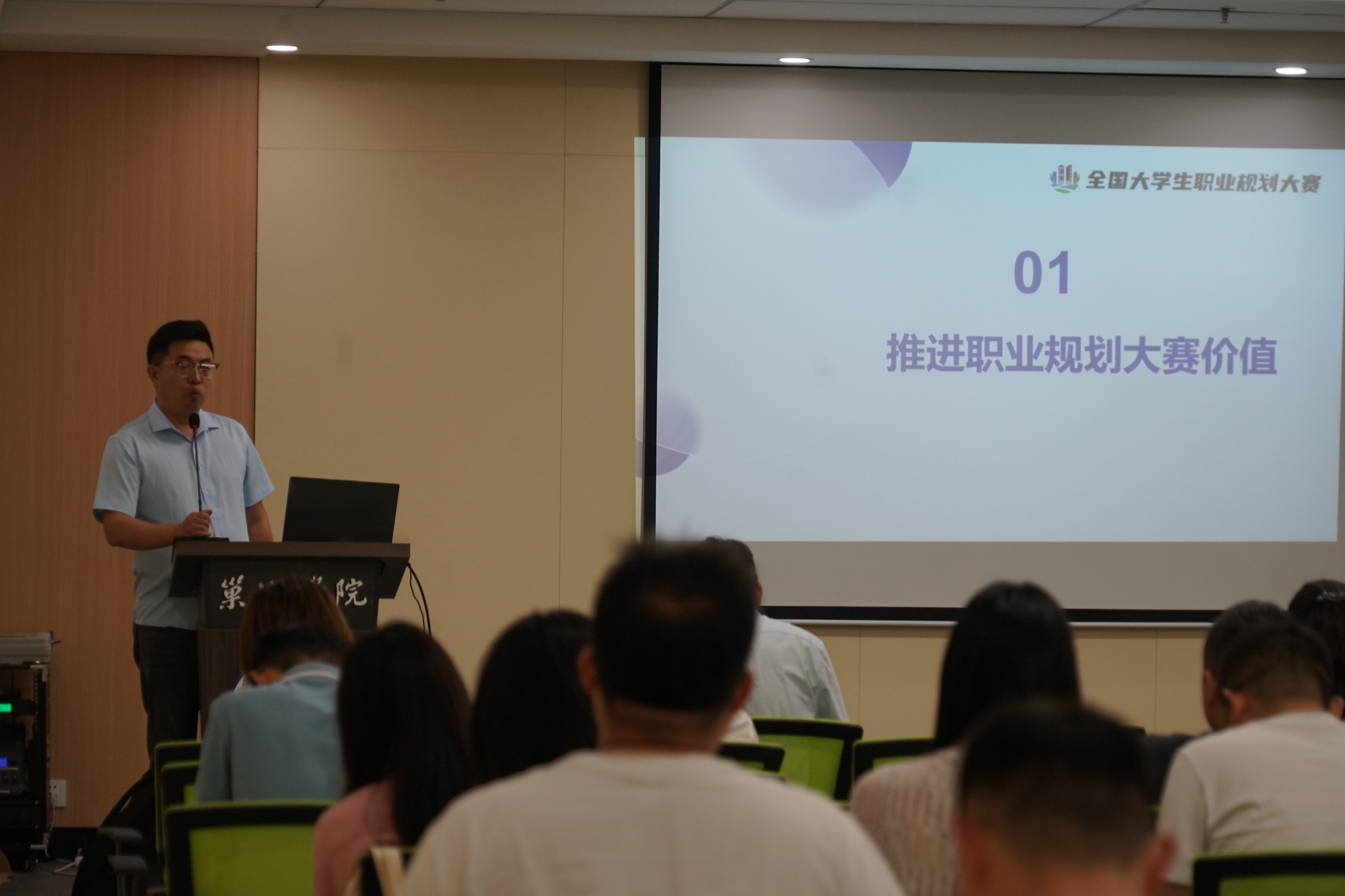 培训会还邀请了安徽致行树教育科技有限公司总经理吴遇作第三届全国职业规划大赛赛前指导。他结合自身指导选手获全国金奖的经历,通过具体参赛案例剖析,分享了职业规划大赛选手的遴选标准、培育方式,鼓励指导教师督导学生利用好寒暑假时间丰富实践经历,并对PPT等参赛材料打磨给出具体建议,阐述了推进职业规划大赛的价值与意义。指导内容有效帮助参训教师提高了对大赛的认识,更指明了高成长型选手和项目的遴选辅导方向。