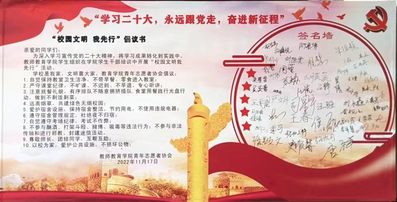 为深入学习宣传贯彻党的二十大精神,将学习成果转化为实际行动,11月17日下午,教师教育学院发起“校园文明 我先行”倡议活动。教师教育学院2022年学生干部培训班全体成员参加。