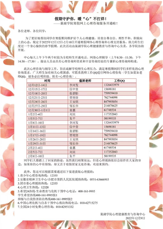 心理健康教育是一个需要学校、家庭和社会共同合作的系统工程。在疫情防控政策调整的背景下,面对新形势新问题,以心育人,育心育德,促进学生身心健康,是每个教师的职责所在。学校心理健康教育中心始终坚持习近平新时代中国特色社会主义思想为指导,紧紧围绕立德树人根本任务,不断提高心理健康教育与咨询服务水平,助力学生健康成长!(文、图/王安琪 初审/郑艳 终审/华紫武)