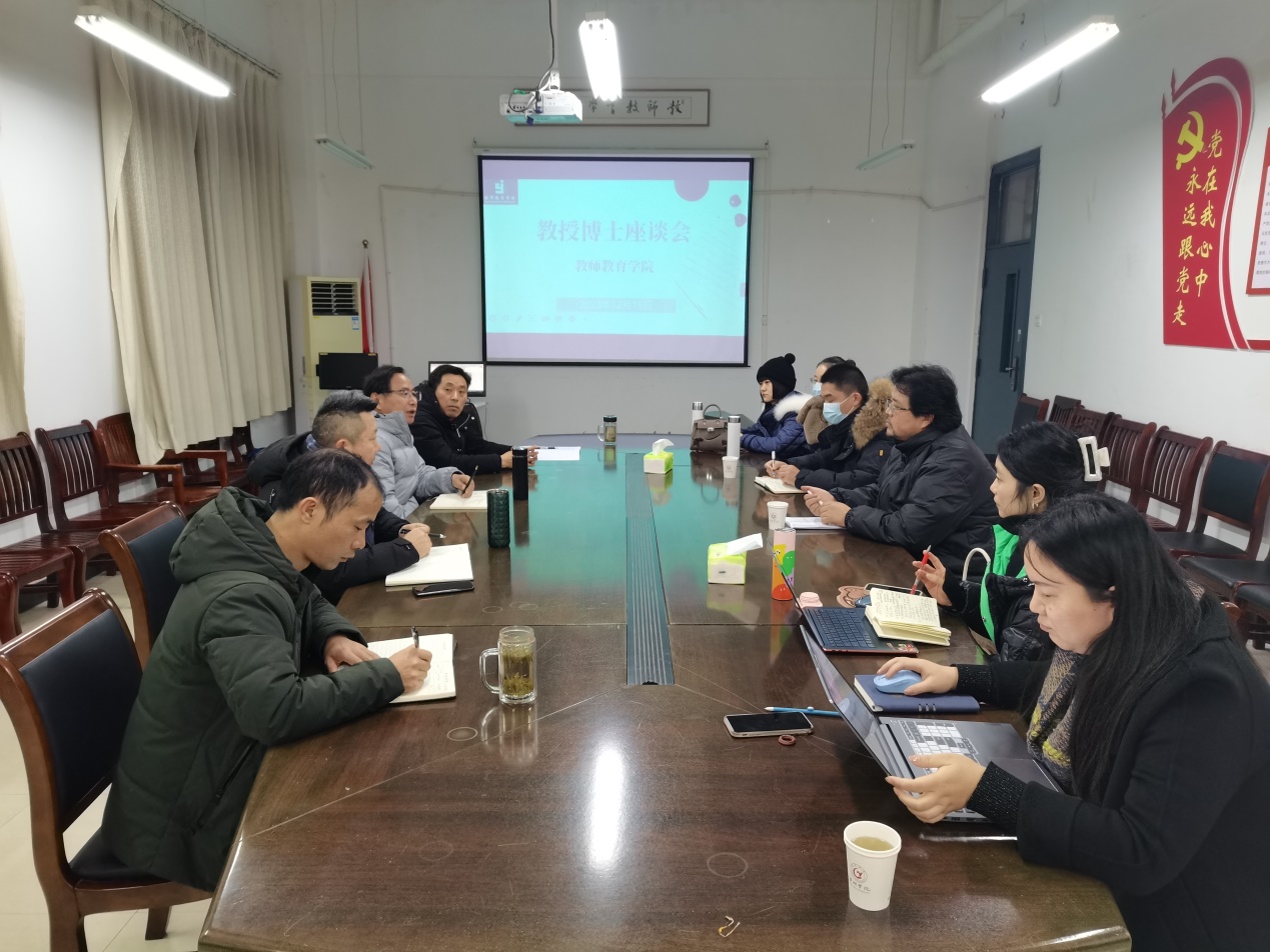 为进一步推动学院事业高质量发展,12月15日,教师教育学院召开教授博士座谈会,就学院的教学、科研和管理等工作听取教授和博士的意见和建议,学院领导班子、所有教授、博士参加会议,会议由院党委书记朱玉票主持。