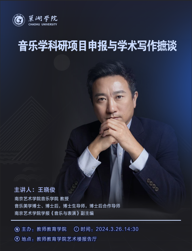 为促进学院学科建设和科研工作高质量发展,进一步提高广大教师的科研学术水平。3月26日-27日,教师教育学院诚邀南京艺术学院音乐学院院长、音乐美学博士生导师,博士后合作导师,南京艺术学院学报《音乐与表演》副主编王晓俊教授来我院作学术讲座。教师教育学院副院长(主持工作)蔡广、副书记兼音乐系主任左劲中、音乐表演专业负责人顾婷婷以及音乐系全体教师和学生代表参加了此次讲座。