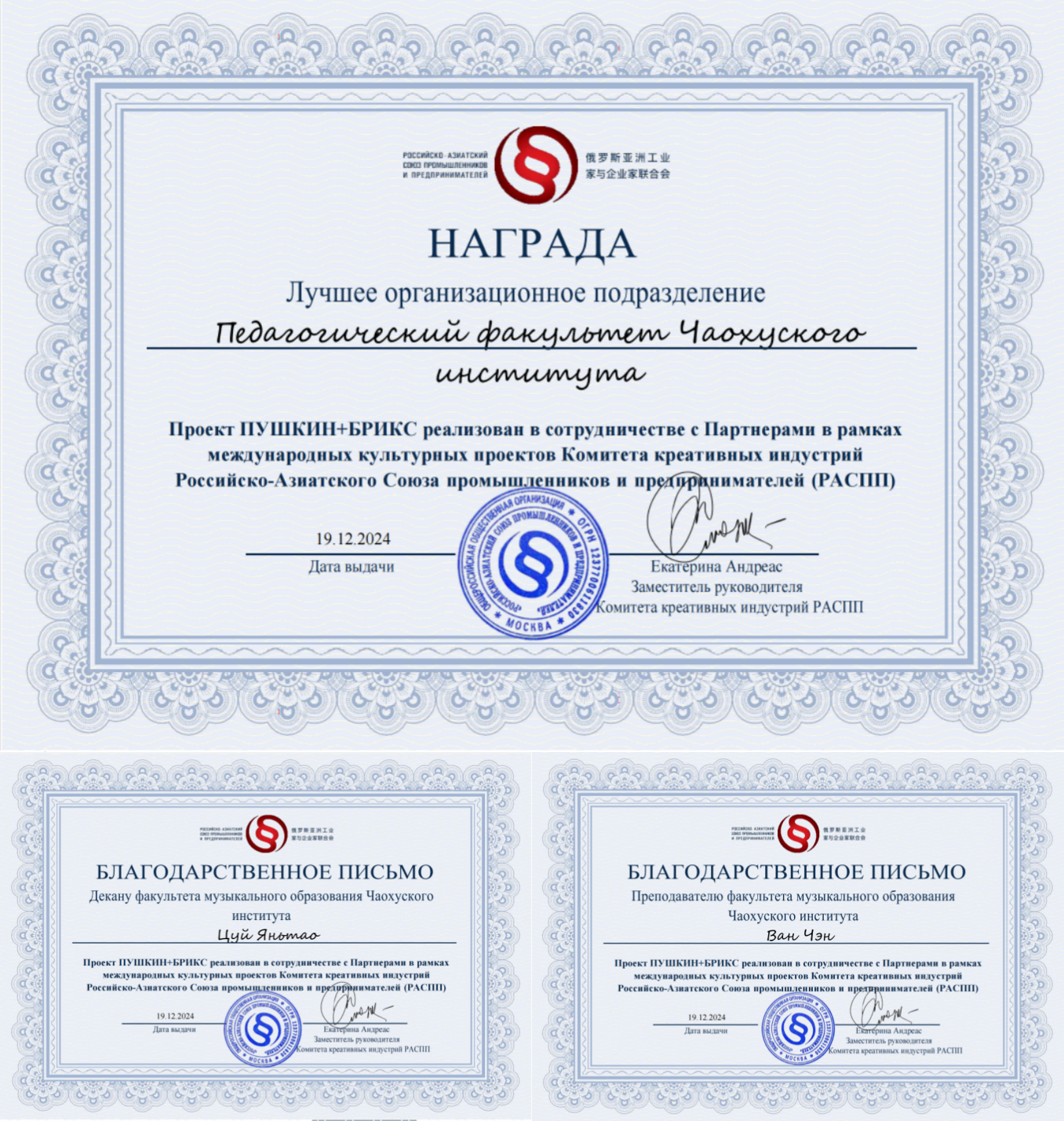 近日,教师教育学院青年教师崔雁涛博士、王程博士在“普希金+金砖”国际音乐大赛评审中,以卓越的专业素养和严谨的评审态度,助力学院荣获俄罗斯-亚洲工业家与企业家联合会创意产业委员会(РАСПП)授予的“最佳组织部门”称号。该荣誉旨在表彰awc777万象城娱乐官网在“普希金+金砖”国际文化项目框架下,为推动国际文化交流与教育合作所作出的突出贡献。两位年轻教师同时获得比赛组委会授予的“杰出指导教师”提名表彰。