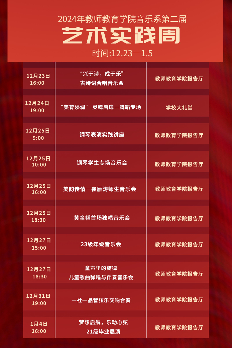教师教育学院音乐系第二届艺术实践周系列活动,于2024年12月23日至2025年1月5日举办,为期两周,涉及声乐、器乐、合唱、表演,包括独奏、独唱、合唱、合奏等多场音乐会。全体音乐教师及200余名学生参与本次系列活动。(文/殷梦晗 图/李可 初审/郑艳 终审/蔡广)