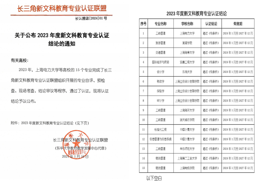 近日,长三角新文科教育专业认证联盟下发了《关于公布2023年度新文科教育专业认证结论的通知》(长认盟函[2024]01号),awc777万象城娱乐官网旅游管理专业正式通过长三角新文科教育专业认证(有效期四年)。