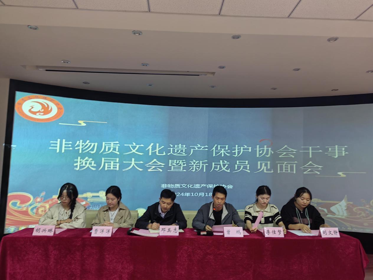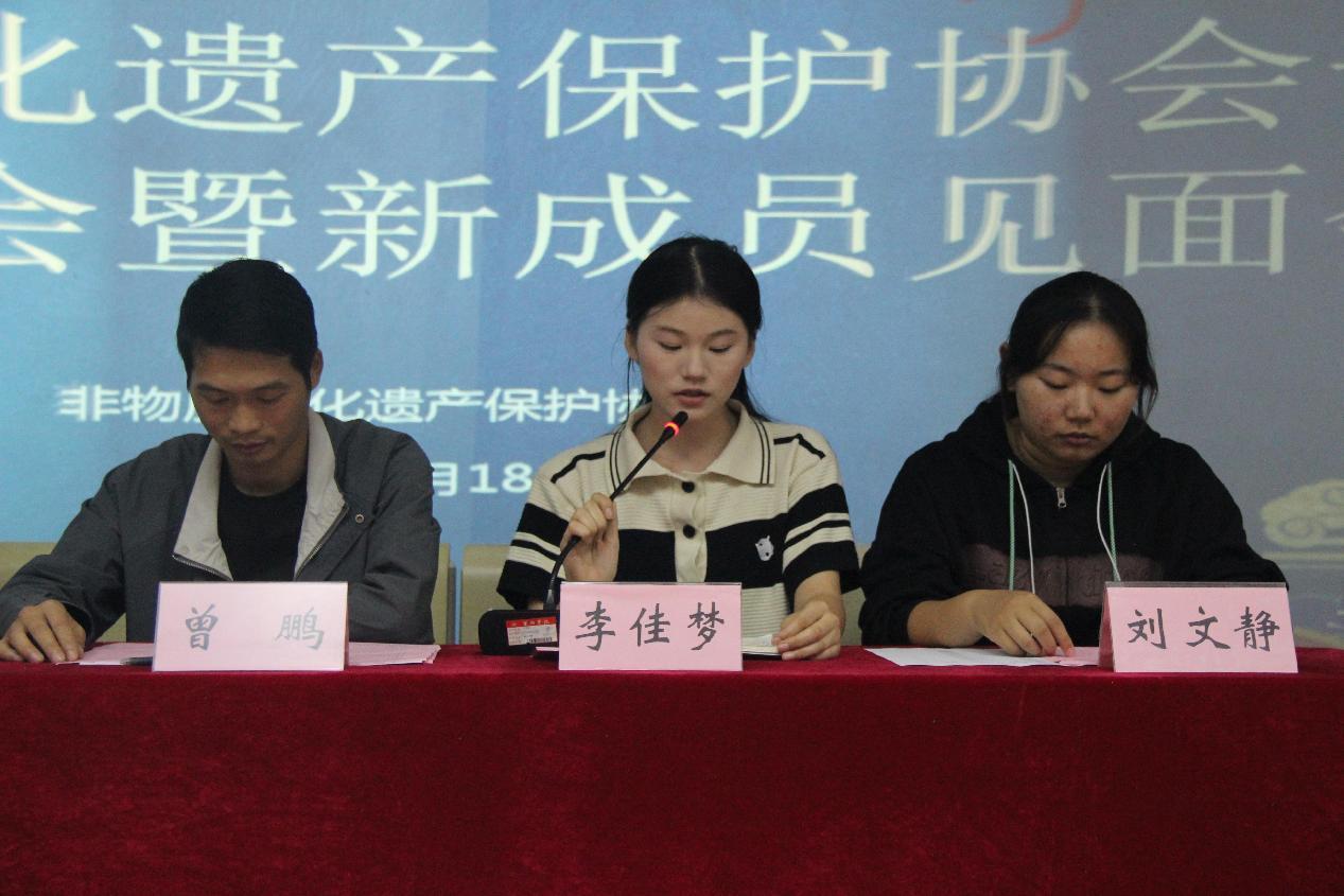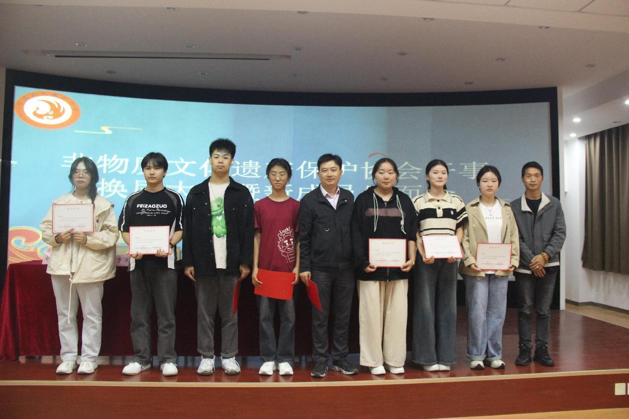 曾鹏向新社员们详细介绍了非物质文化遗产协会的发展历程和近年取得的主要成绩,并在会上给大家交流展示有关非遗项目。曹洋洋宣布新一任非遗协会干事人员名单,邓其志为2023—2024学年非遗社团优秀社员颁发证书并合影留念。