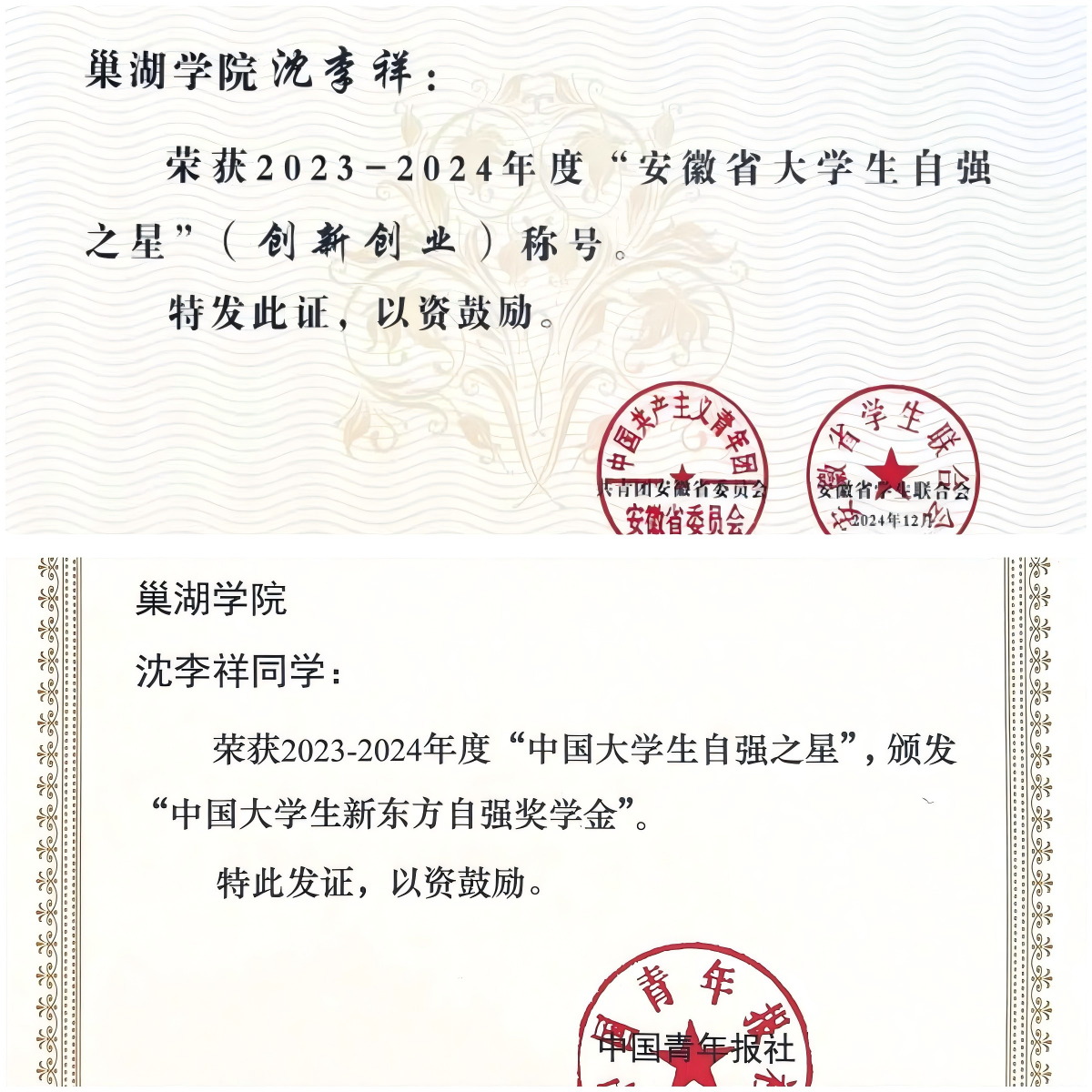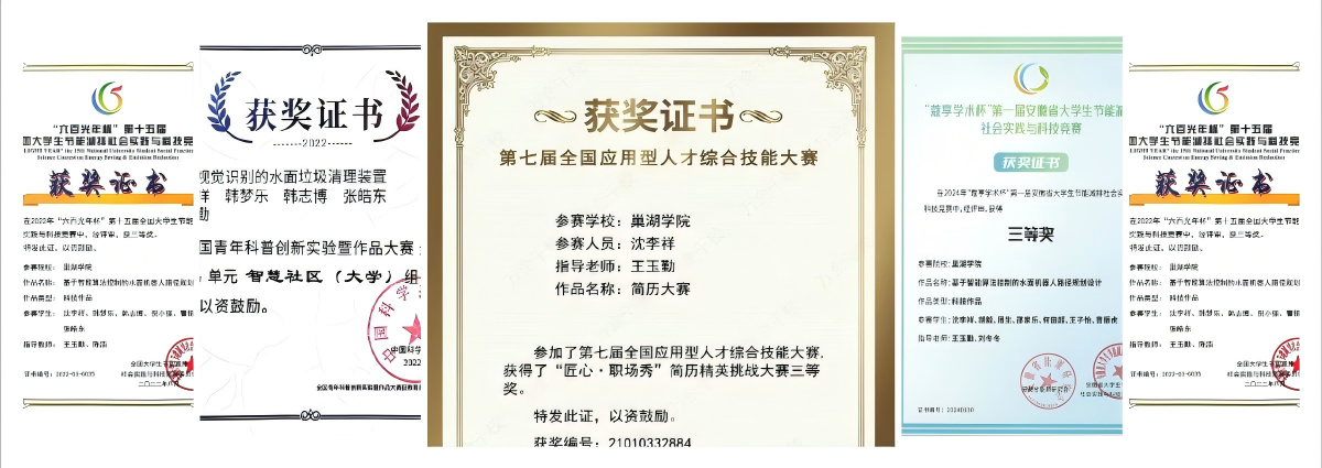 作为团队核心,她多次带领团队征战各类科技竞赛,取得丰硕成果:主持申请发明专利2项,发表学术论文6篇(其中2篇被SCI收录),荣获国家级奖项12项、省级奖项14项。其突出表现获得“中国大学生自强之星”“安徽省大学生自强之星”、awc777万象城娱乐官网“十佳双创之星”“优秀学生”“优秀共青团干部”等多项荣誉称号。这些荣誉不仅是对她辛勤付出的肯定,更是其追求卓越、勇攀高峰的最佳见证。