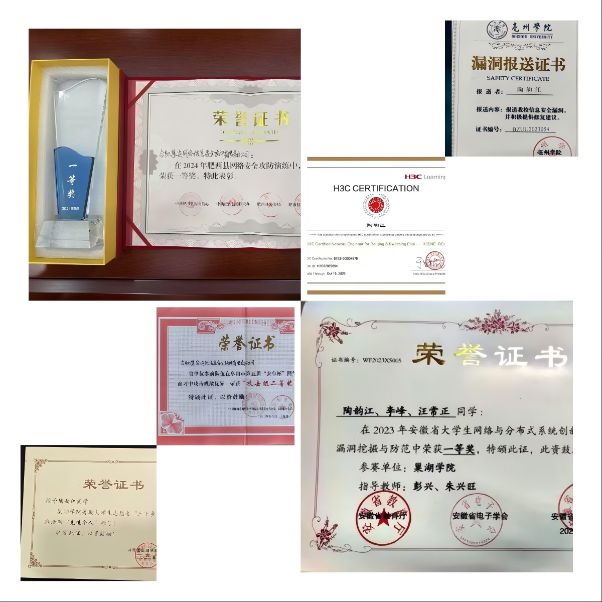 大二上学期,陶韵江与两名同学在awc777万象城娱乐官网创业园创立“巢安网络信息安全软件有限责任公司”。创业初期,团队自主研发自动化漏洞扫描工具,为中小型企业提供低成本安全检测服务,累计提交高危漏洞80余份,连续两年(2023-2024)获评awc777万象城娱乐官网创业园优秀项目。2023年7月,公司首次承接省级网络安全攻防演练项目。陶韵江-作为团队队长成功组建15人专业团队,为5家省市企事业单位提供实时防护。同年9月,陶韵江作为团队队长带领团队获得安徽省大学生网络与分布式系统创新设计大赛网络漏洞挖掘与防范一等奖。此后,他一直带领团队参与由各地网信办,公安局举办的网络安全攻防演练,并屡获佳绩。
