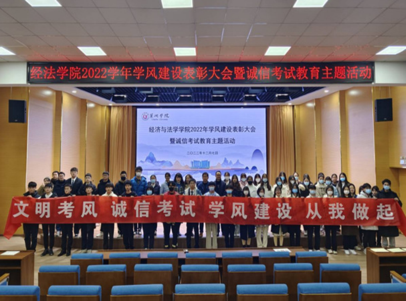 为进一步加强学院学风建设,推进学生考风考纪教育,经济与法学学院于12月7日在求实楼报告厅召开2022学年学风建设月表彰大会暨诚信考试教育主题活动,表彰大会上,经济与法学学院党委书记石庭对同学们寄予厚望,他希望同学们能够深刻把握“德学并举,知行合一”校训内涵,涵养高尚品行,培养优良学风,严肃考风考纪,弘扬诚信品德,为经法学院学风建设添砖加瓦,全体学生在“文明考风,诚信考试”横幅上签名合照,做出诚信考试从我做起的郑重承诺。同时各专业通过主题班会形式落实诚信考试教育。班会上,辅导员向同学们解读学校考风考纪要求和违规违纪后果,让学生牢固树立起诚信考试的思想意识。同学们认真阅读诚信考试承诺书,对个人、班级、学院、学校作出承诺,自觉遵守考场规定,杜绝违规违纪行为的发生。