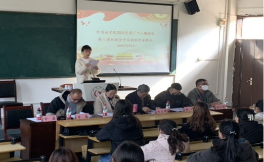 12月6日中午,外国语学院于明德楼西二阶梯教室举行第三十八期业余党校开班典礼。院党委书记张蕊、院长余荣琦、院党委副书记李磊、副院长余鹏、院团委副书记余仁能出席典礼,典礼由班主任方磊主持,全体学员参会。