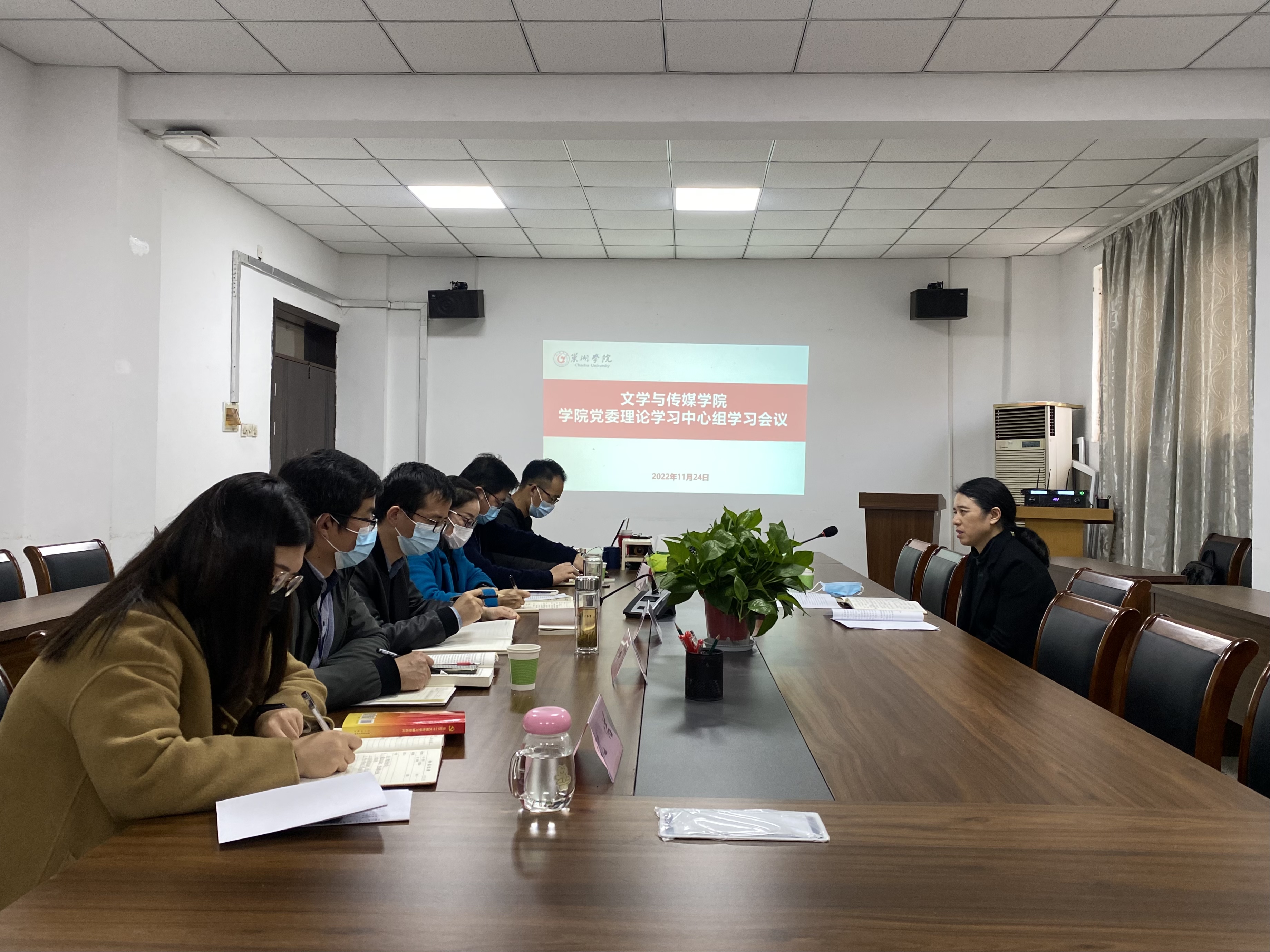 为全面系统深入学习宣传贯彻党的二十大精神,11月24日下午,文学与传媒学院党委理论学习中心组召开专题学习研讨会,副校长朱定秀到会指导,全体党委委员参加会议,会议由党委书记袁凤琴主持。