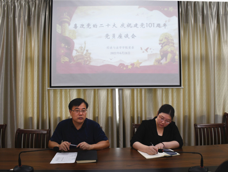 为庆祝中国共产党成立101周年,引导学生党员以奋发昂扬的精神面貌迎接党的二十大胜利召开,在“七一”来临之际,经济与法学学院于6月24日上午在求实楼三楼会议室召开“青春献礼二十大,强国有我新征程”主题党员座谈会。经济与法学学院党委书记王万海、党委副书记孙玮出席会议。