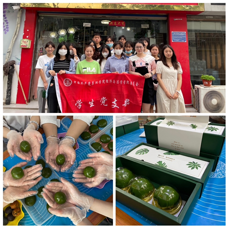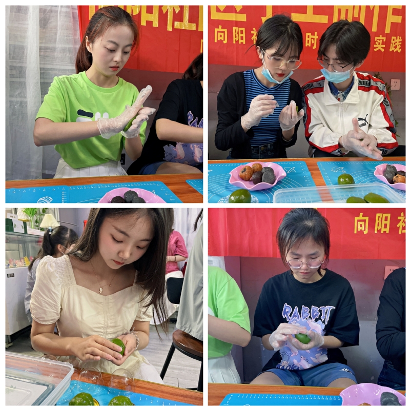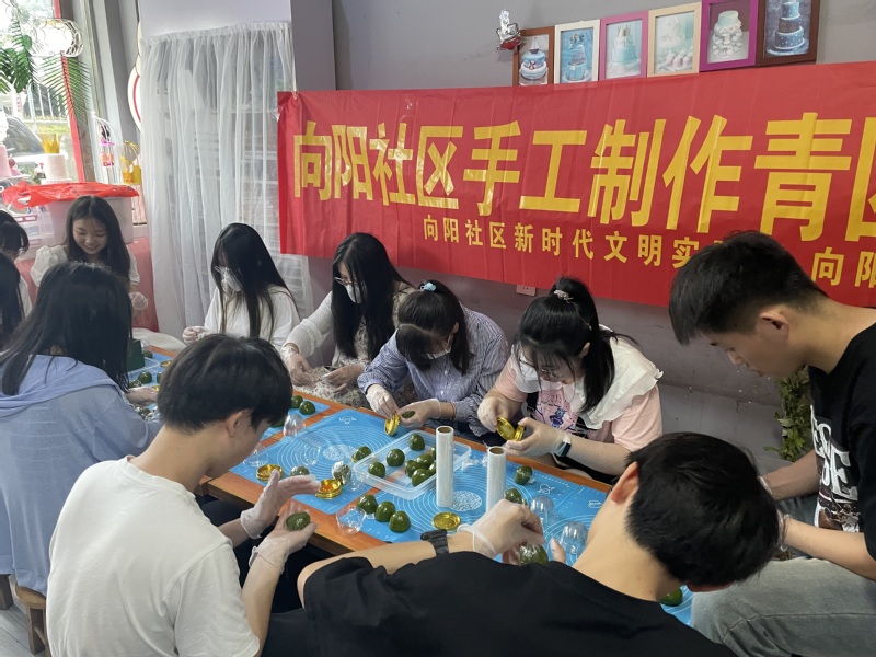 听完负责人绘声绘色的描述,同学们对青团的包制跃跃欲试,纷纷戴上手套,小心翼翼地拿起青团外皮揉圆、按扁、放馅。一些心灵手巧的同学率先完成了青团的包制并分享了包青团的手法和技巧,大家一边学习交流,一边述说着端午节的由来。随后,同学们用精致的包装盒为青团打包,这给青团增添了不少节日的仪式感。
