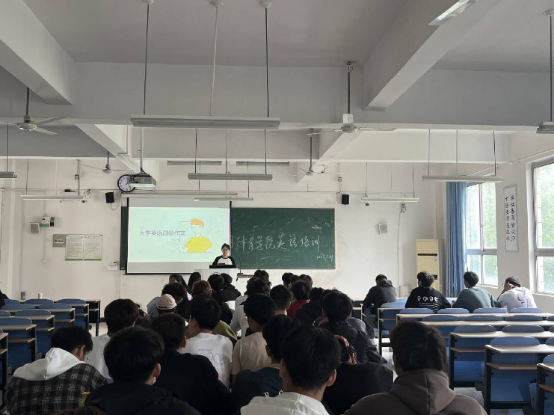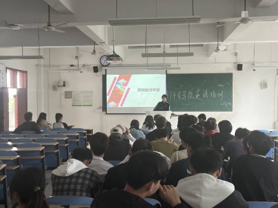 活动伊始,体育学院英语辅导项目负责人叶鑫磊热烈欢迎两名主讲人同学,对本次项目活动进行简要介绍,希望同学们能够认真听课,有所收获。肖连欢以大学英语四级作文为主讲专题内容,她精选了一些具有典型性的正反两个方面的英语作文,分析部分作文中存在的突出问题,介绍优质作文中的框架结构、遣词造句、亮点特色等,同时她向同学们介绍了不同主题类型作文的写作技巧,帮助同学们有效梳理英语写作的方法步骤。王艺璇以大学英语四级翻译为主讲专题内容,她为同学们细致讲解了翻译的答题步骤与技巧,强调翻译中追求“信、达、雅”三要素,总结归纳了四级考试中常用的短语与句型。整个活动过程中,同学们认真做笔记,学习氛围浓厚。会上,两名主讲人就同学们提出的问题进行逐一耐心解答。