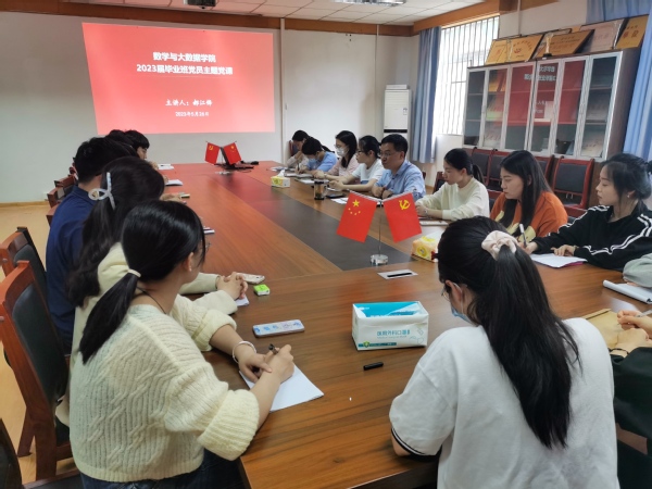 为深入开展学习贯彻习近平新时代中国特色社会主义思想主题教育,加强毕业生党员教育,5月29日下午,数学与大数据学院在笃行楼二楼学院会议室开展毕业生党员专题党课。此次党课由学院党委副书记郝江锋主讲,毕业班辅导员和全体毕业生党员参加。