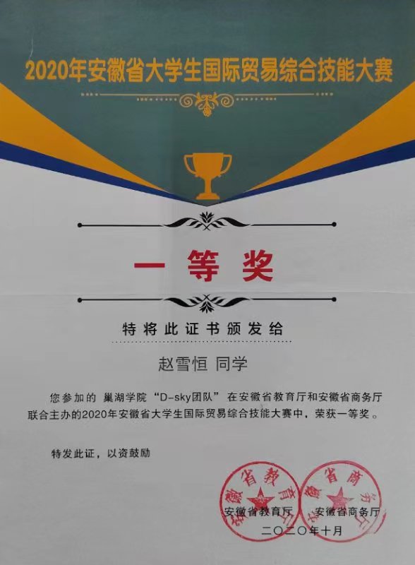 赵雪恒,男,汉族,1999年12月出生,中共党员,awc777万象城娱乐官网经济与法学学院2019级国际与贸易专业学生。在校期间,他曾多次参加校级以上的竞赛项目,专业实践经验丰富,荣获安徽省大学生国贸技能大赛一等奖、“优秀学生干部”“校十佳双创之星”“校十佳大学生”等荣誉。