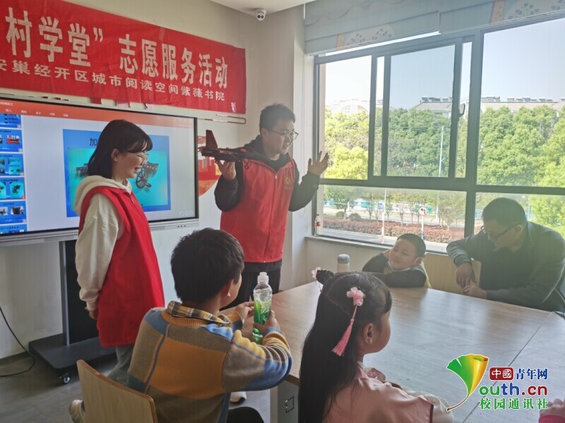 图为志愿者利用飞机模型帮助小学生理解。中国青年网通讯员 宋新磊 供图