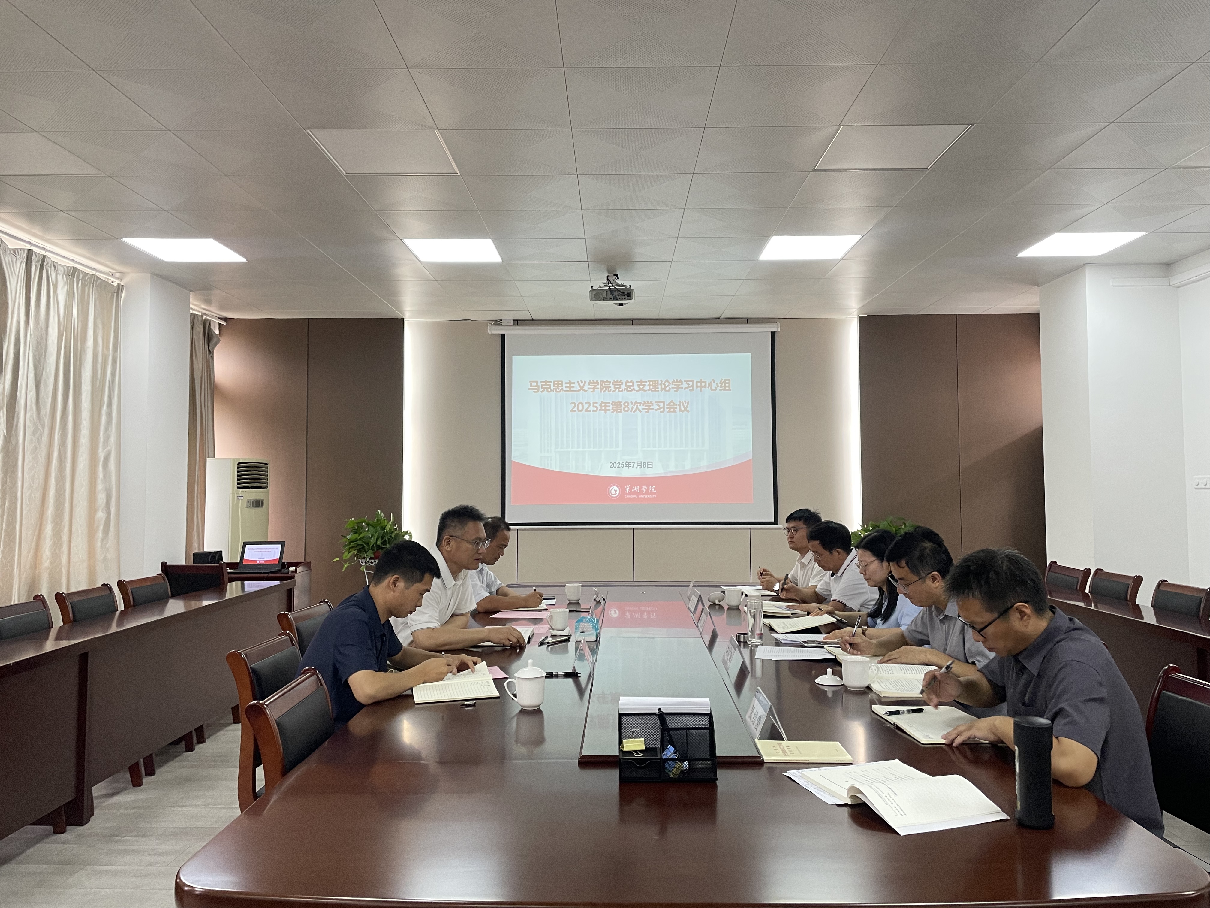 7月8日下午,马克思主义学院党总支在学院会议室召开理论学习中心组2025年第8次学习会议,学院党总支理论学习中心组成员参加学习。校党委书记周峰莅临指导,旅游管理学院党委书记洪作奎、党务(行政)秘书曾鹏列席旁听。马克思主义学院党总支书记杨芳主持会议。