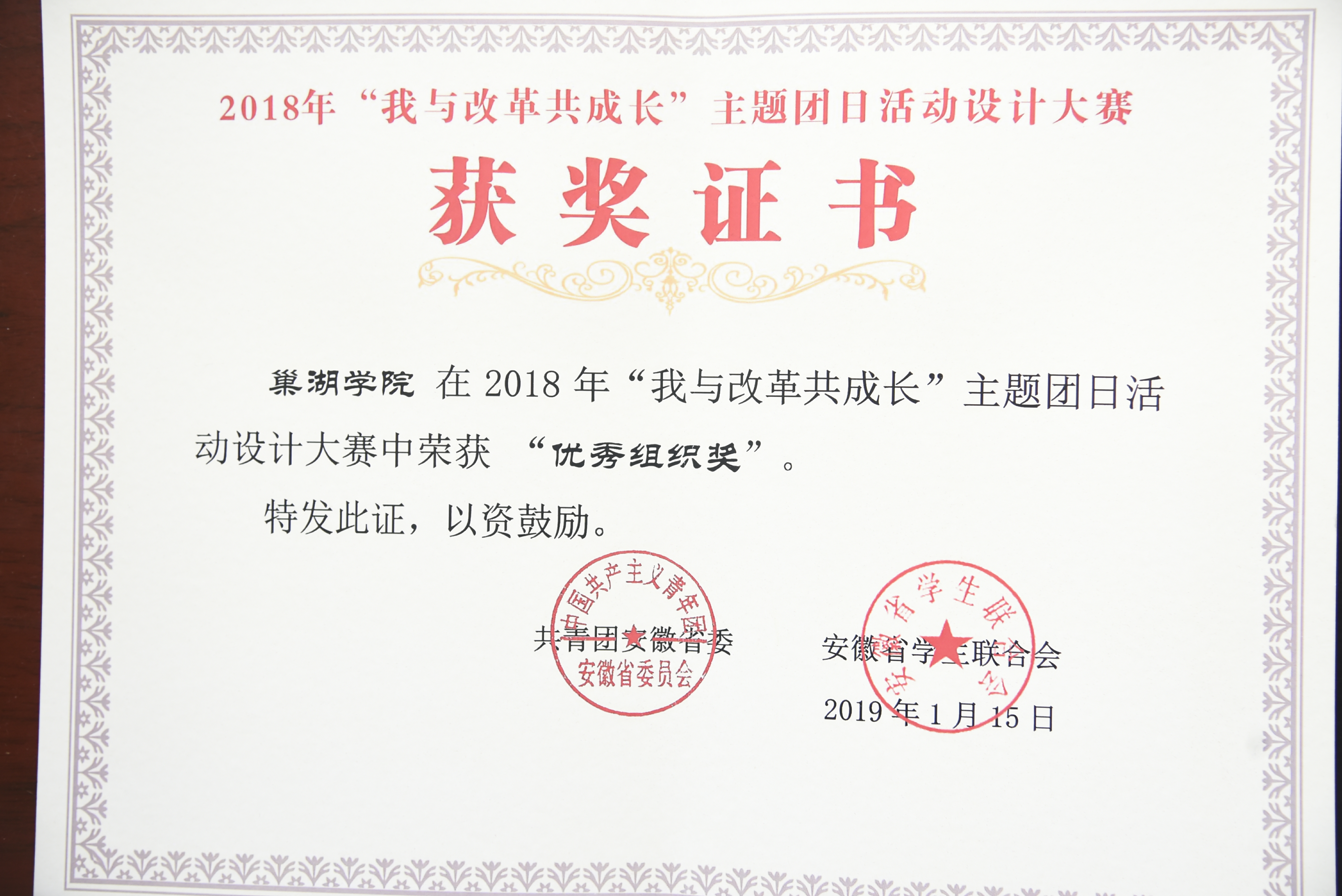 2018年“我与改革共成长”主题团日活动设计大赛获奖证书
