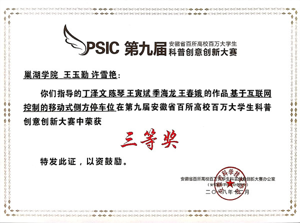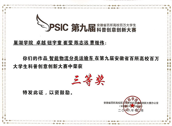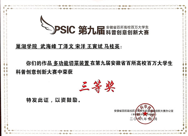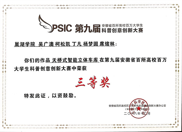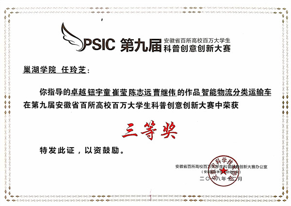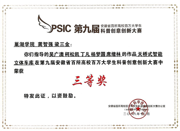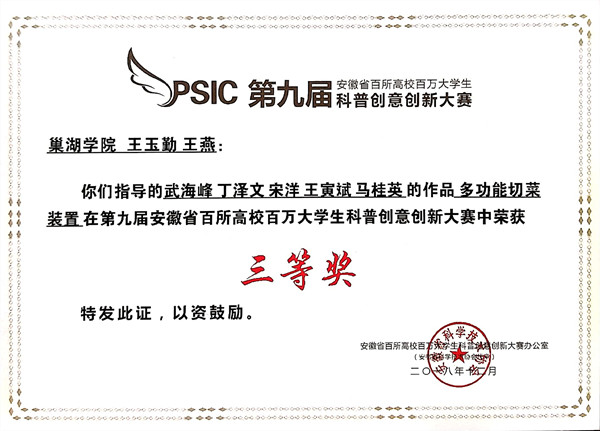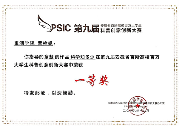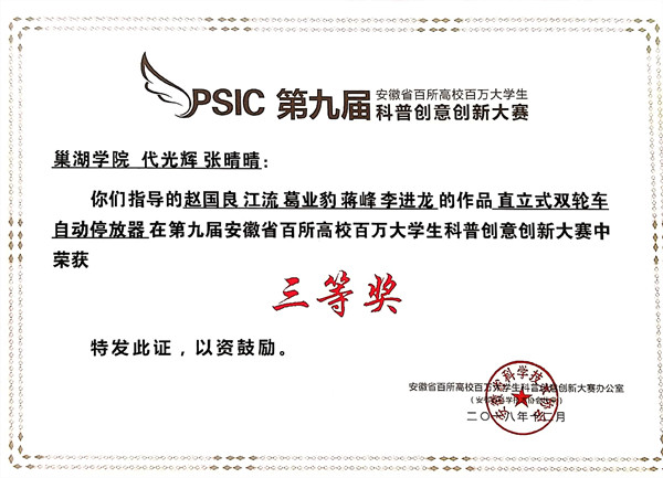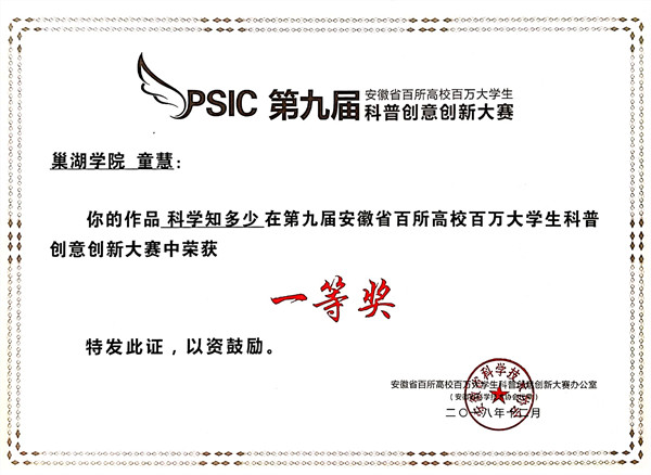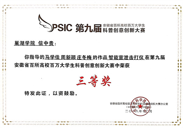 第九届安徽省百所高校百万大学生科普创意创新大赛获奖证书