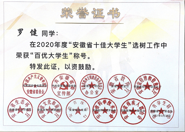 2020年度“安徽省十佳大学生”“百优大学生”荣誉证书