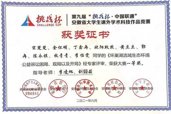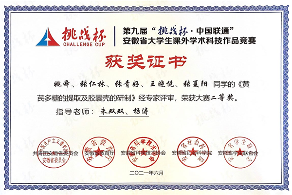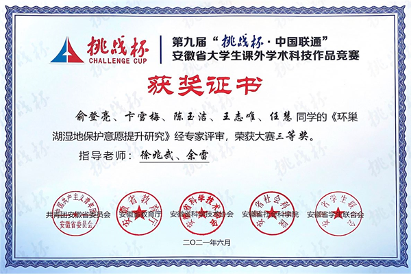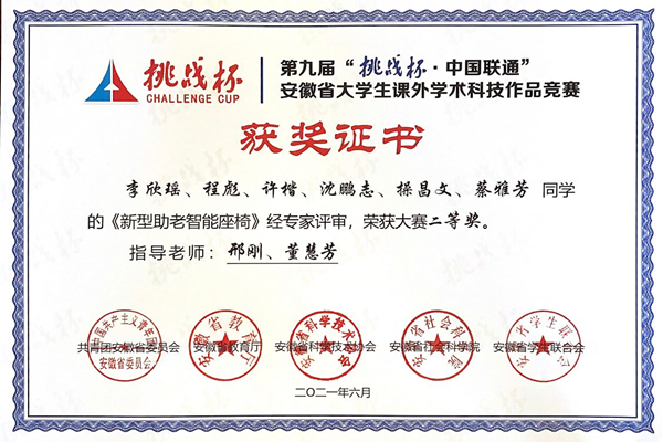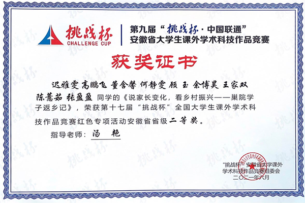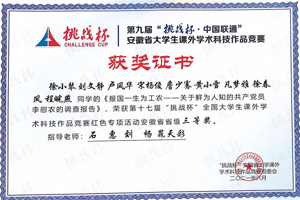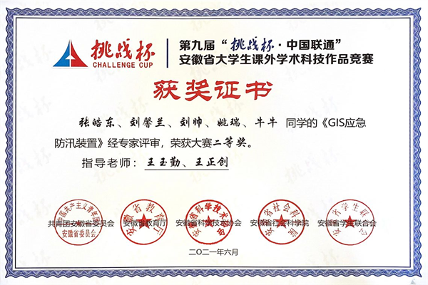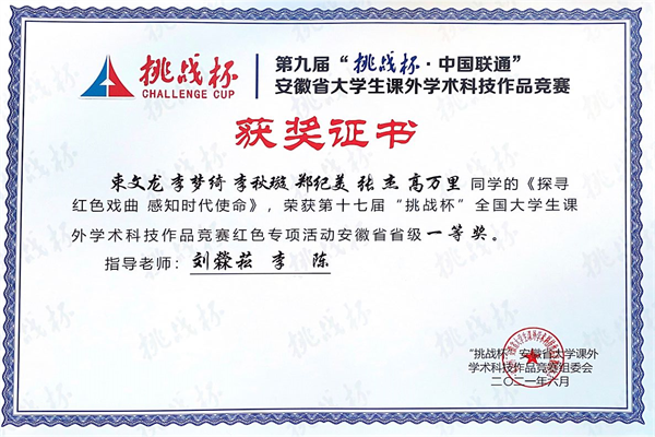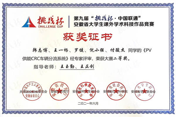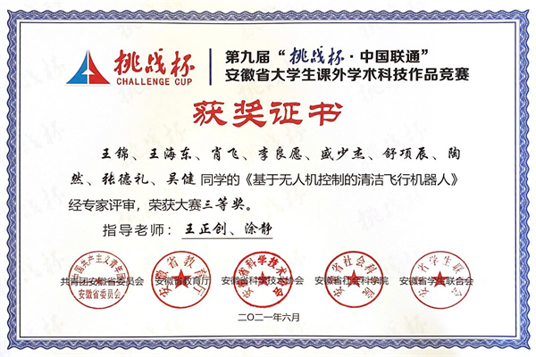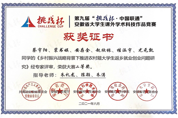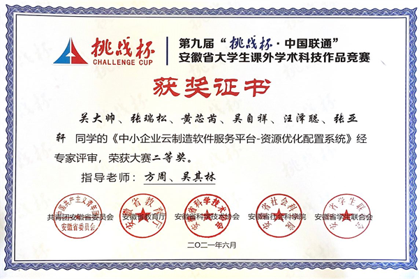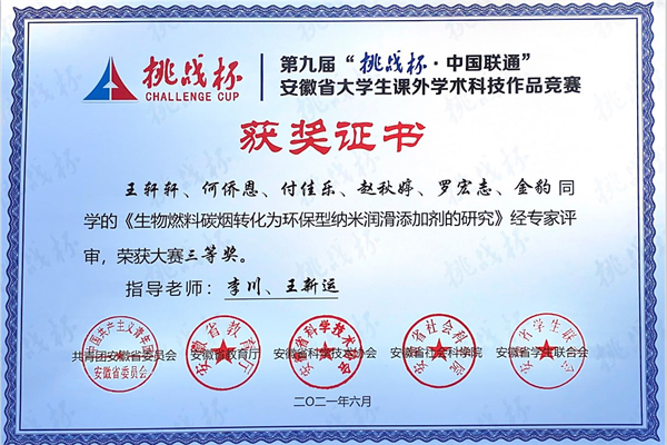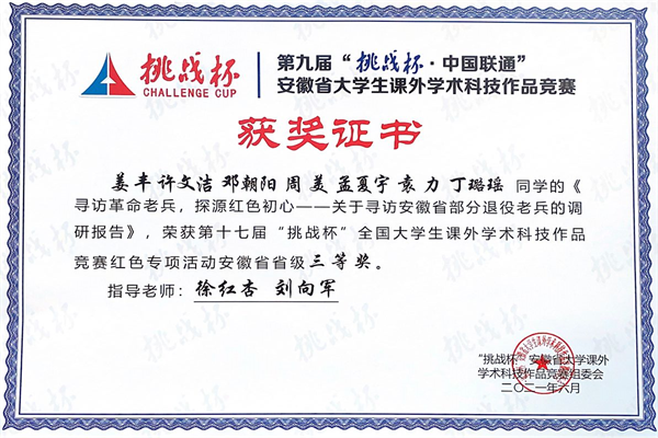 第九届“挑战杯·中国联通”安徽省大学生课外学术科技作品竞赛获奖证书