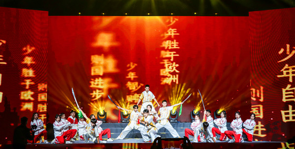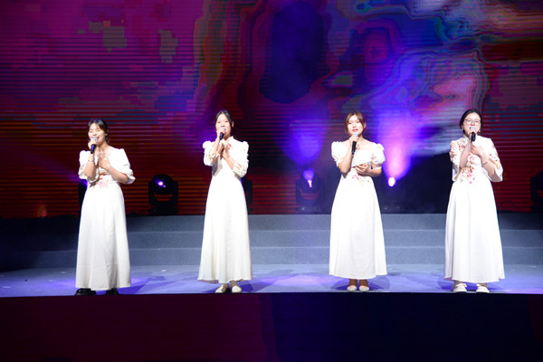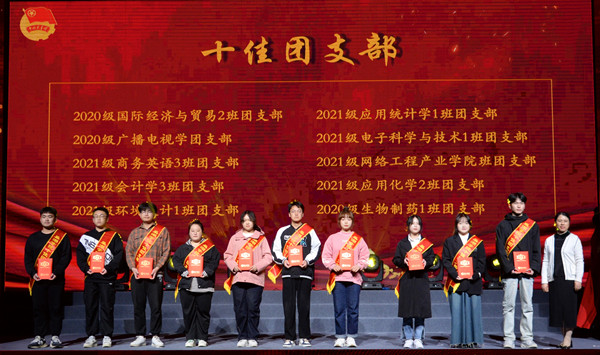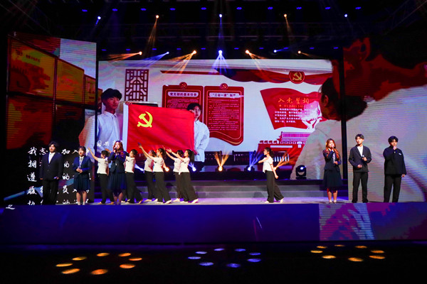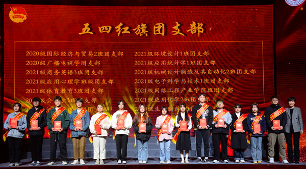 主题晚会分为“觉醒·担当”“青春·奋斗”“强国·有我”三个篇章,并对共青团工作考核先进单位、五四红旗团支部、十佳大学生、十佳青年志愿者、十佳自强之星、优秀共青团员、优秀共青团干部等11类先进集体和个人进行颁奖表彰。一场令人期盼已久的主题晚会在一首雄壮激烈的鼓乐节目《新编龙腾虎跃》中正式开启,朗诵《风范与家产》、群舞《活着1937》、歌曲联唱《映山红》《不忘初心》《万疆》《我爱你,中国》、独唱《裹着心的光》、朗诵《你们•我们》、四重唱《如愿》、街舞与武术表演《武动青春》、歌伴舞《有我》、视频作品《理想·未来》、大合唱与器乐合奏《万泉河水清又清》《我和我的祖国》精彩纷呈,表演或深沉婉转或激昂澎湃,再现了一代又一代青年与党同心、跟党奋斗,在革命、建设和改革的历史进程中,激扬青春,建功立业,开拓人生,用生命和热血书写凌云志、谱写凯旋歌的动人场景。晚会将艺术味、思政味、青年味、时代味完美融合,发出了“请党放心 强国有我”的青春誓言,奏出了“艰苦奋斗 强我中华”的青春最强音,使线上线下一万多名师生观众为之动容,在领略艺术之美中深受精神洗礼。浓浓的爱党爱国爱团情怀洋溢在田径场上,表达在线上留言区里,曲终舞散,很多人还久久不愿离去,一起唱和晚会歌曲,回味晚会意蕴。
