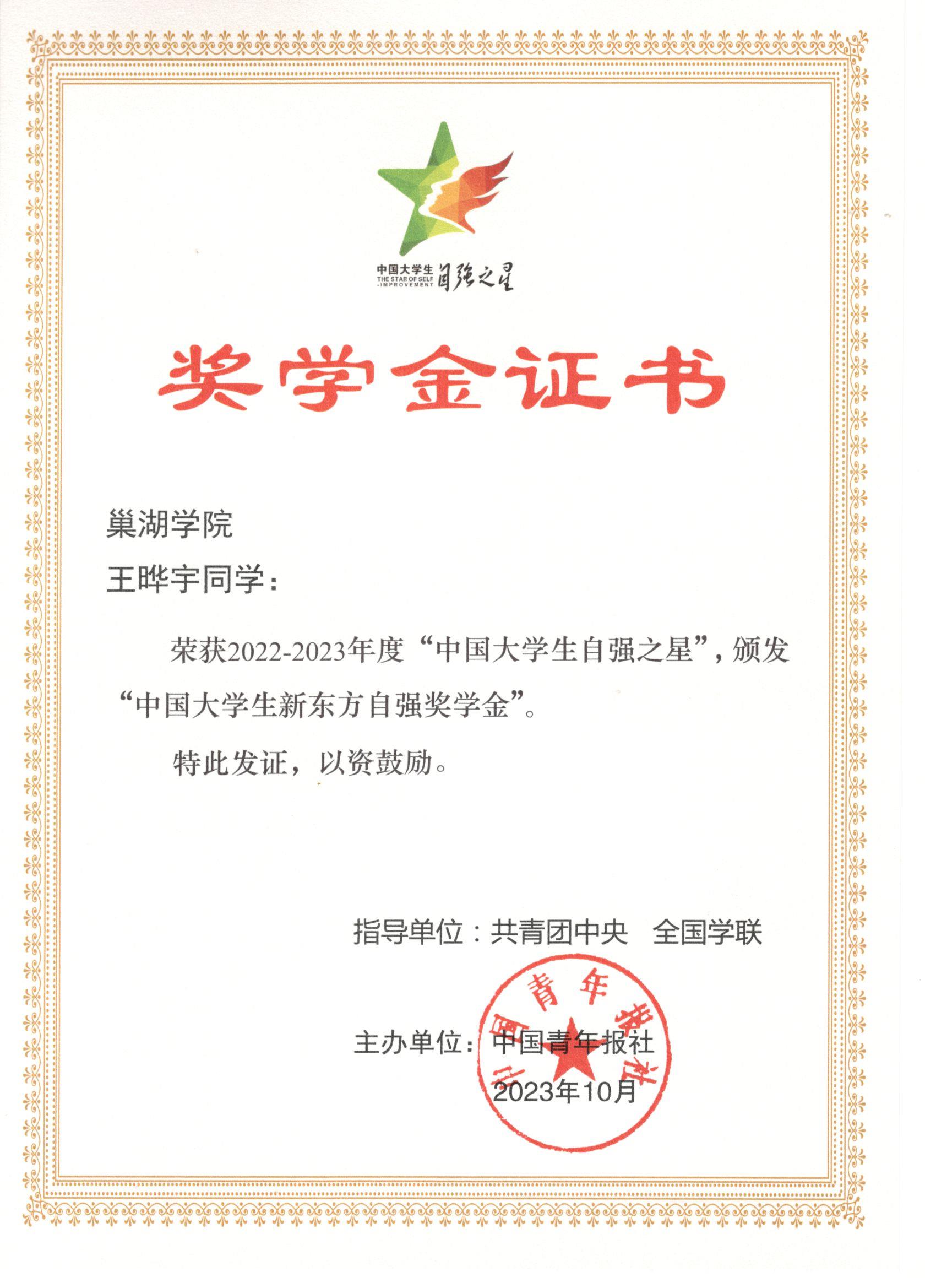 2022-2023年度“中国大学生自强之星”证书