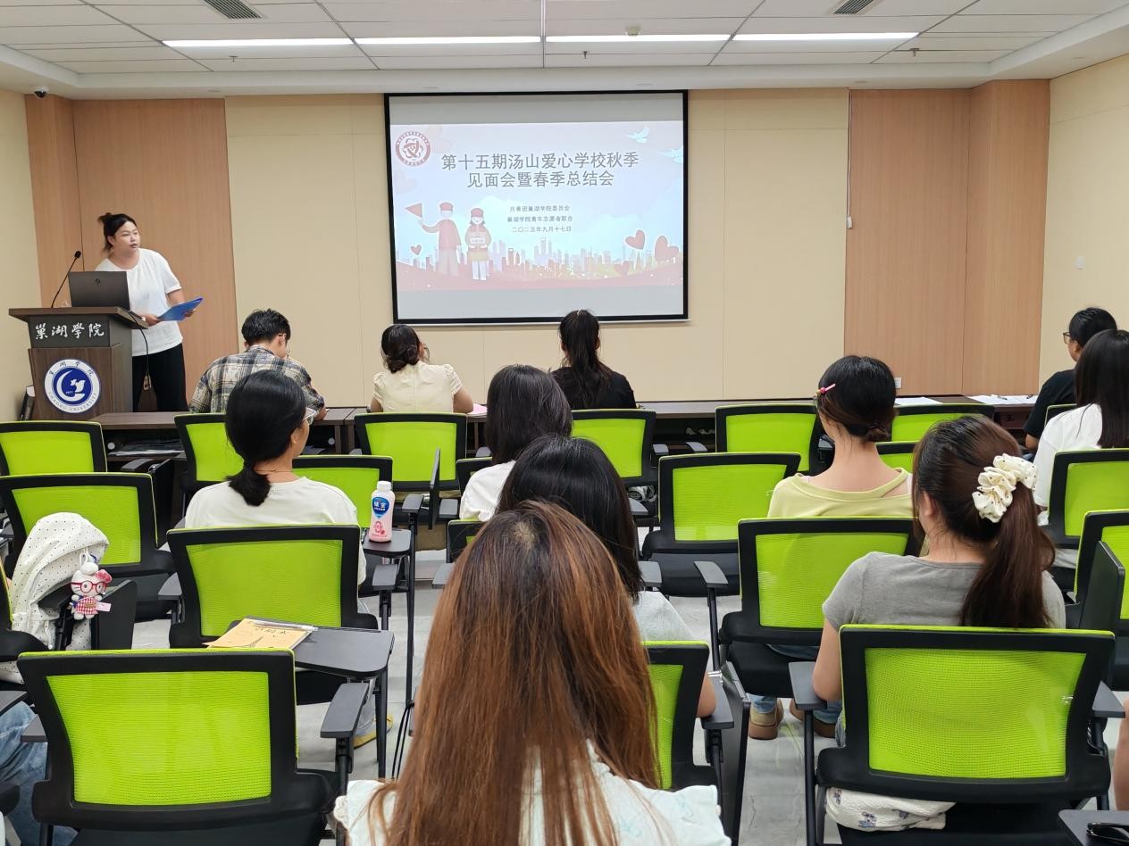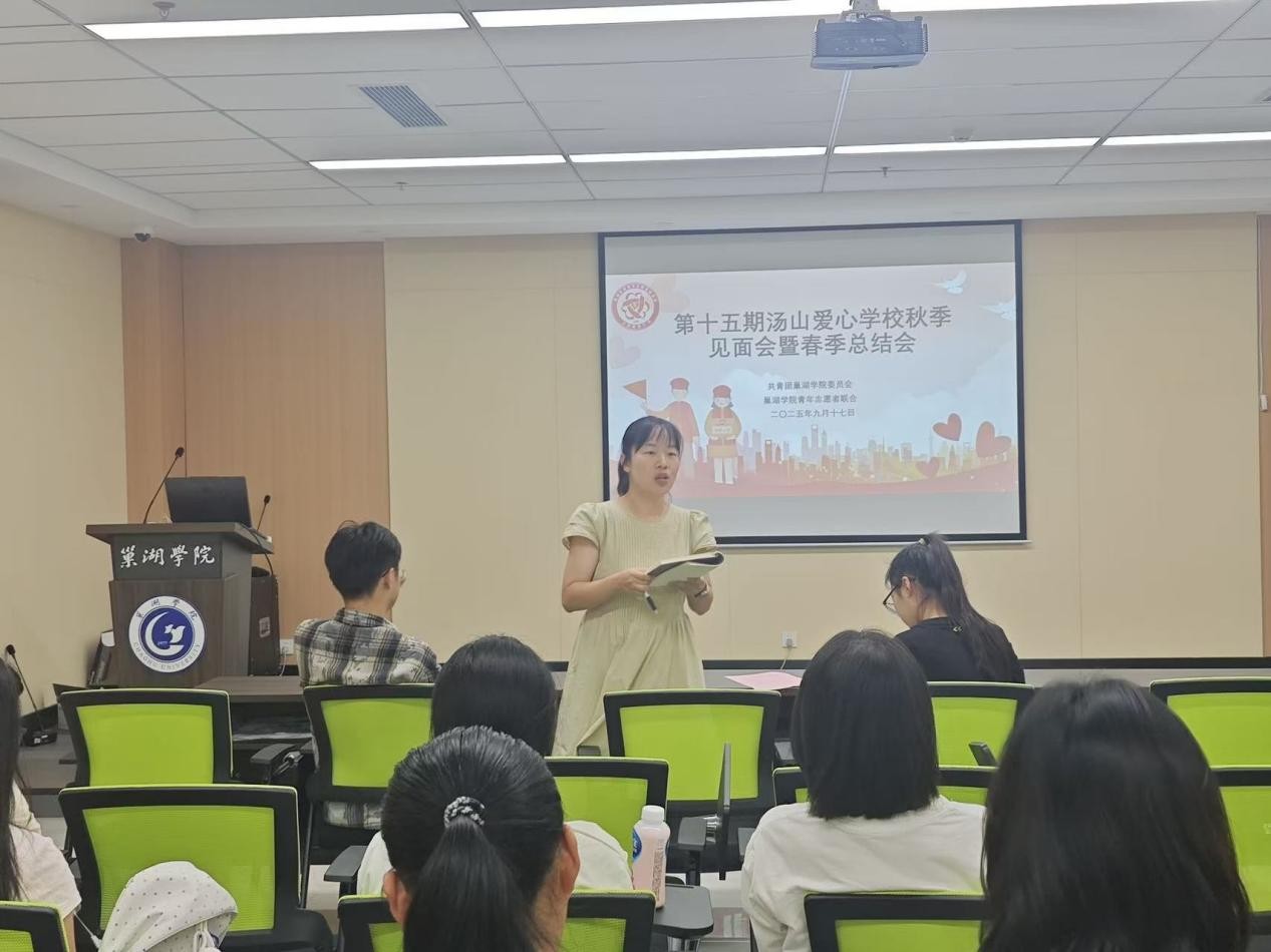 汤山爱心学校负责人胡佳乐首先对春季支教工作进行总结。她介绍,上一学期汤爱共对接巢湖市周边2所小学,累计服务学生36人,开展语文、数学、英语等基础课程教学,整体教学反馈良好,学生在学习兴趣与课堂参与度方面均有显著提升。她也提出在教学资源统一性与课堂互动设计方面仍有优化空间。针对即将开展的秋季支教,她表示将继续服务原有对接学校,加强志愿者教学能力培训,进一步提升支教内容的系统性与针对性。