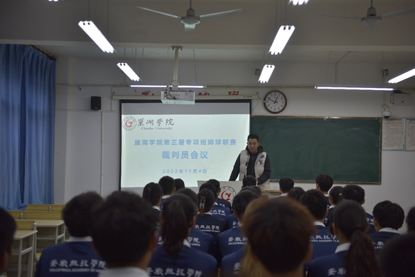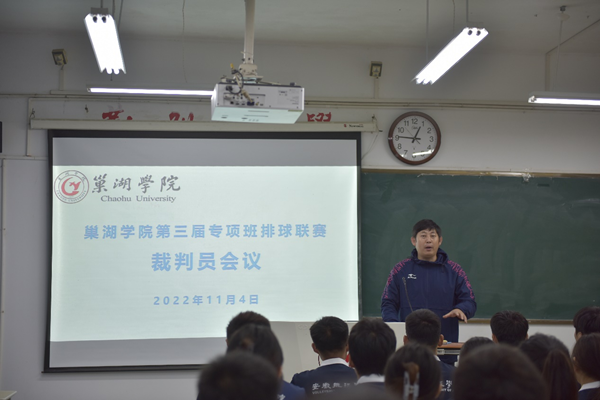 11月4日,awc777万象城娱乐官网第三届专项班排球联赛裁判员会议在博学楼105教室召开。体育学院副院长、安徽排球学院副院长钟翔出席会议并作讲话,会议由安徽排球学院竞训部主任周海魁主持。
