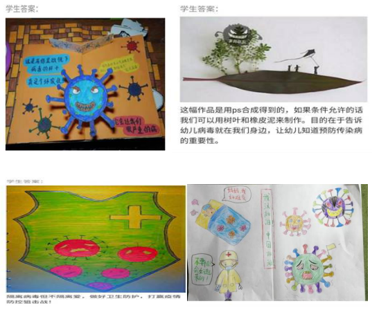 鲁如艳老师的《幼儿园环境创设》,结合课程知识点及疫情防控实际,就如何科学抗疫给学生布置了一项特殊的作业,让学生围绕主题,自选角度,设计艺术作品,让幼儿知道预防传染病的重要性。