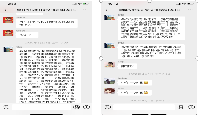突发的新冠肺炎疫情让所有行业都打乱了阵脚,尤其是教育领域,各学校从线下教学转为线上教学,以保证学生学业的完成。然而,对于高校来说,除了课堂上的理论知识学习外,还有一个重要的学习环节——毕业实习,高校如何保证毕业生完成实习任务,如何保障学生在如期毕业时掌握一定的实践能力,这给高校提出了难题。为此,我院学前教育专业教研室根据学校所传达的疫情期间毕业生实习工作要求与安排内容,由教研室主任甘超老师统一部署并顺利推进2020届学前教育专业毕业生的春季实习工作。