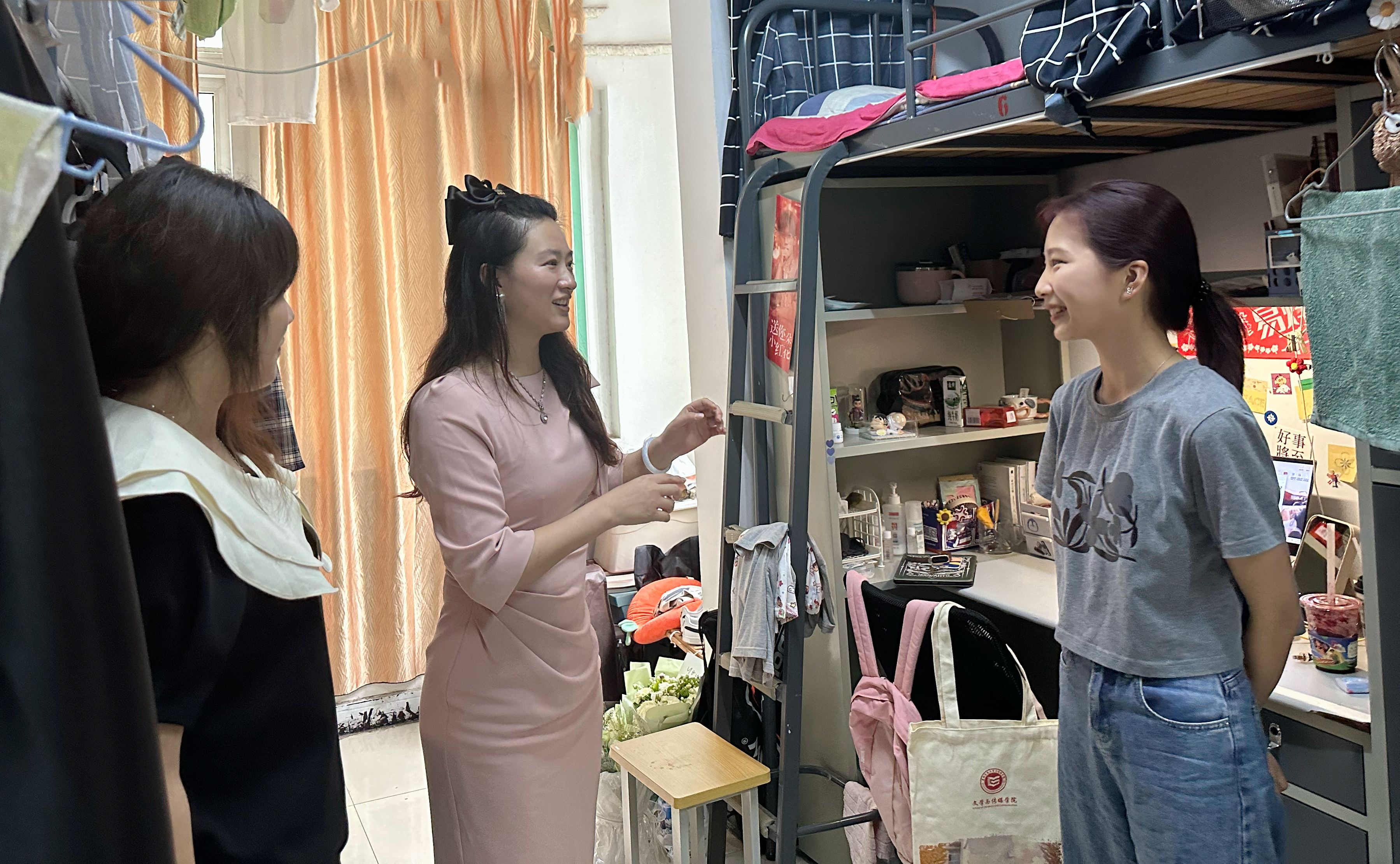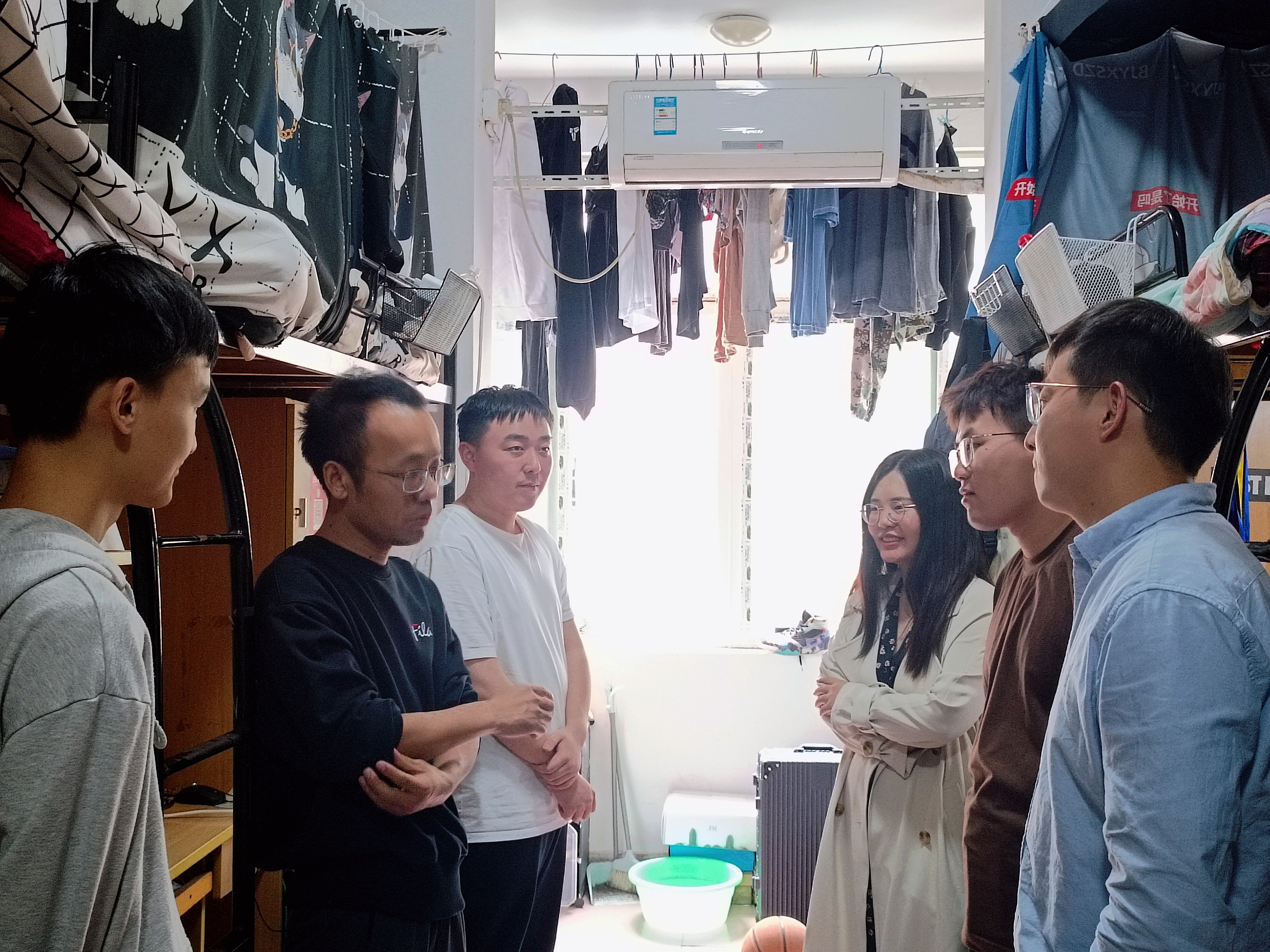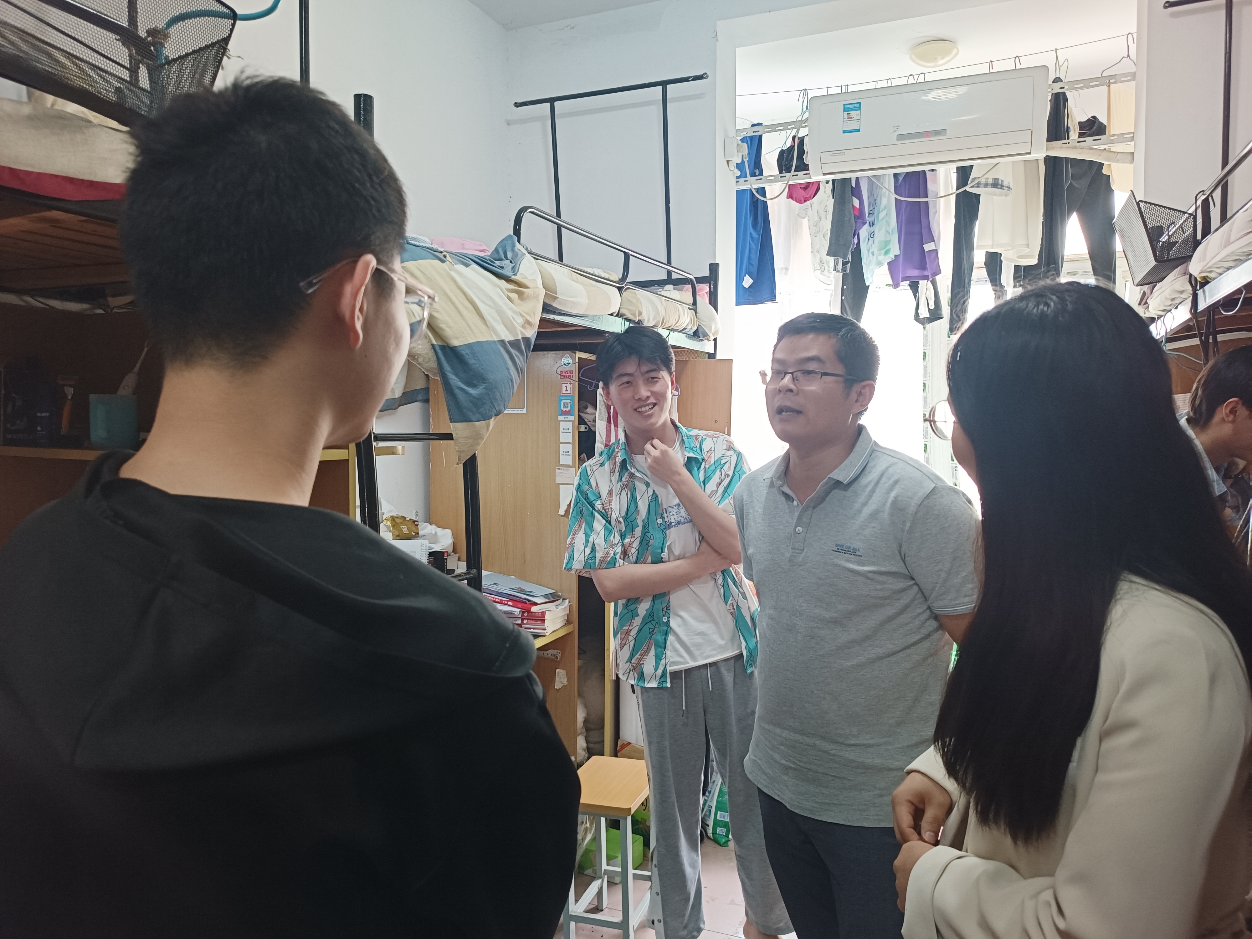 “毕业论文答辩后修改得如何?”“工作找好了吗?”“考研考到哪所学校啦?”“对学校和学院还有什么建议?”每到一间宿舍,老师们都与毕业生亲切交谈,详细了解毕业生目前的就业、升学、未来的发展规划和离校前准备等情况,耐心询问毕业生对学校教育教学、管理服务等方面的意见建议,以及他们生活、就业中存在的困难。听到有的同学已经找到心仪的工作,有的考入名校继续深造,老师们都非常高兴,勉励毕业生们无论是参加工作还是继续深造,都要秉承“德学并举 知行合一”之校训,坚持学思用贯通、知信行统一,坚定理想,不断学习新知识,充实丰富自己,以积极主动的心态面对各种挑战,在新的人生起点上开拓创新、努力奋斗,开辟更广阔的天地。同时,叮嘱毕业生离校期间一定要注意安全,文明离校,并表示学校永远是他们坚实的后盾!