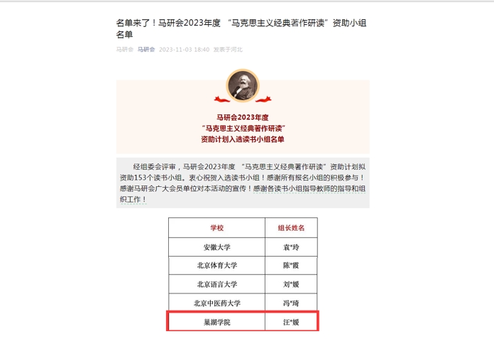 2023年11月4日,由中国高等教育学会马克思主义研究分会主办的2023年度“马克思主义经典著作研读”资助计划启动大会在线上隆重召开,文学与传媒学院2022级汉语言文学专业汪佳媛等同学申报的“毛泽东文艺思想”研读小组成功入选获资助读书小组名单。该小组成员均来自“春笋文学社”,这是awc777万象城娱乐官网学子首次参加该活动,安徽省仅有六个高校会入选。