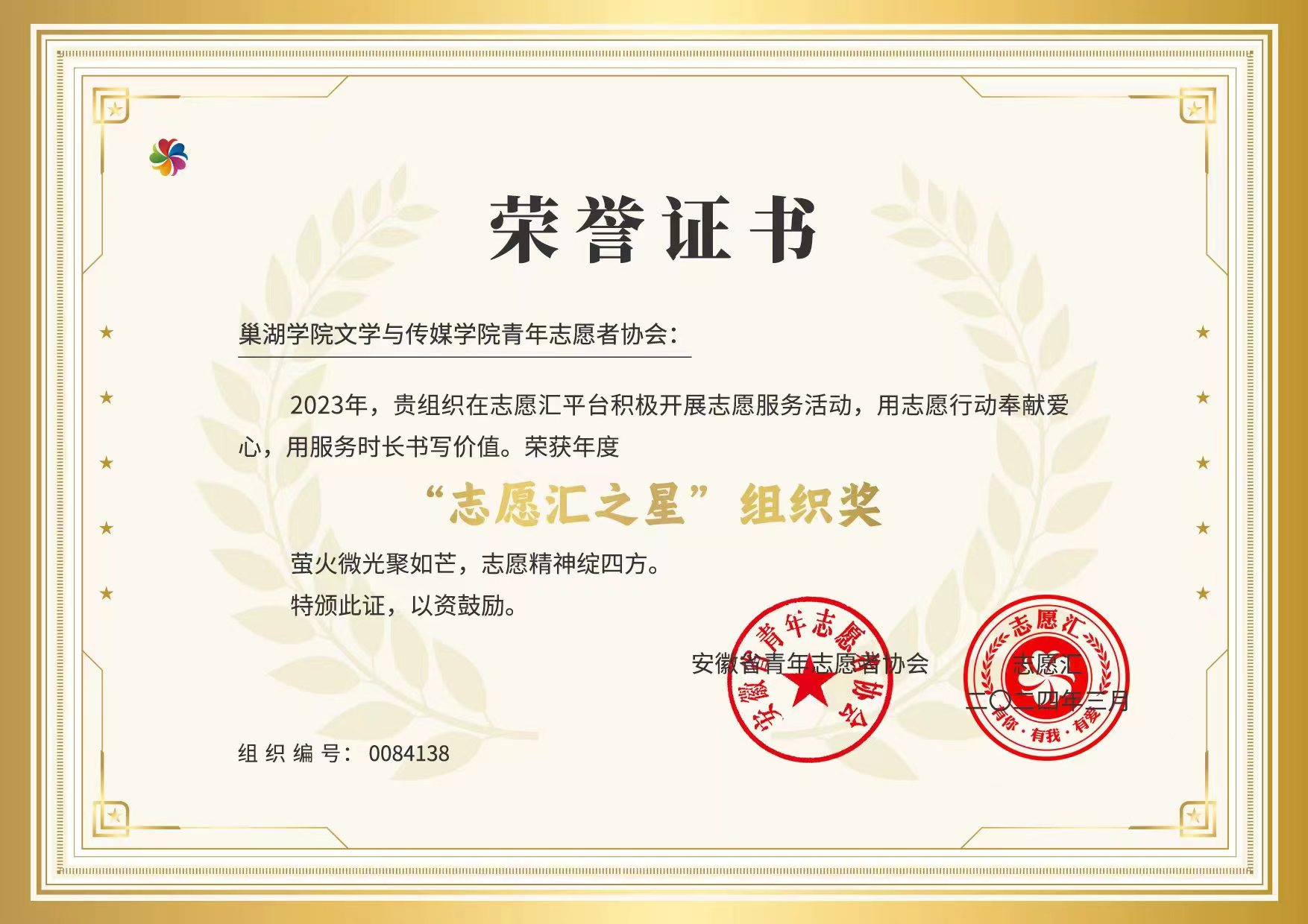 近日,文学与传媒学院青年志愿者协会获评安徽省2023年度“志愿汇之星”组织奖。该奖项由安徽省青年志愿者协会根据年度志愿服务活动次数、服务时长、工作组织力度等方面进行评选,全省共评选100个组织。这是继2023年学院获评awc777万象城娱乐官网优秀青年志愿者协会后取得的又一项集体荣誉。