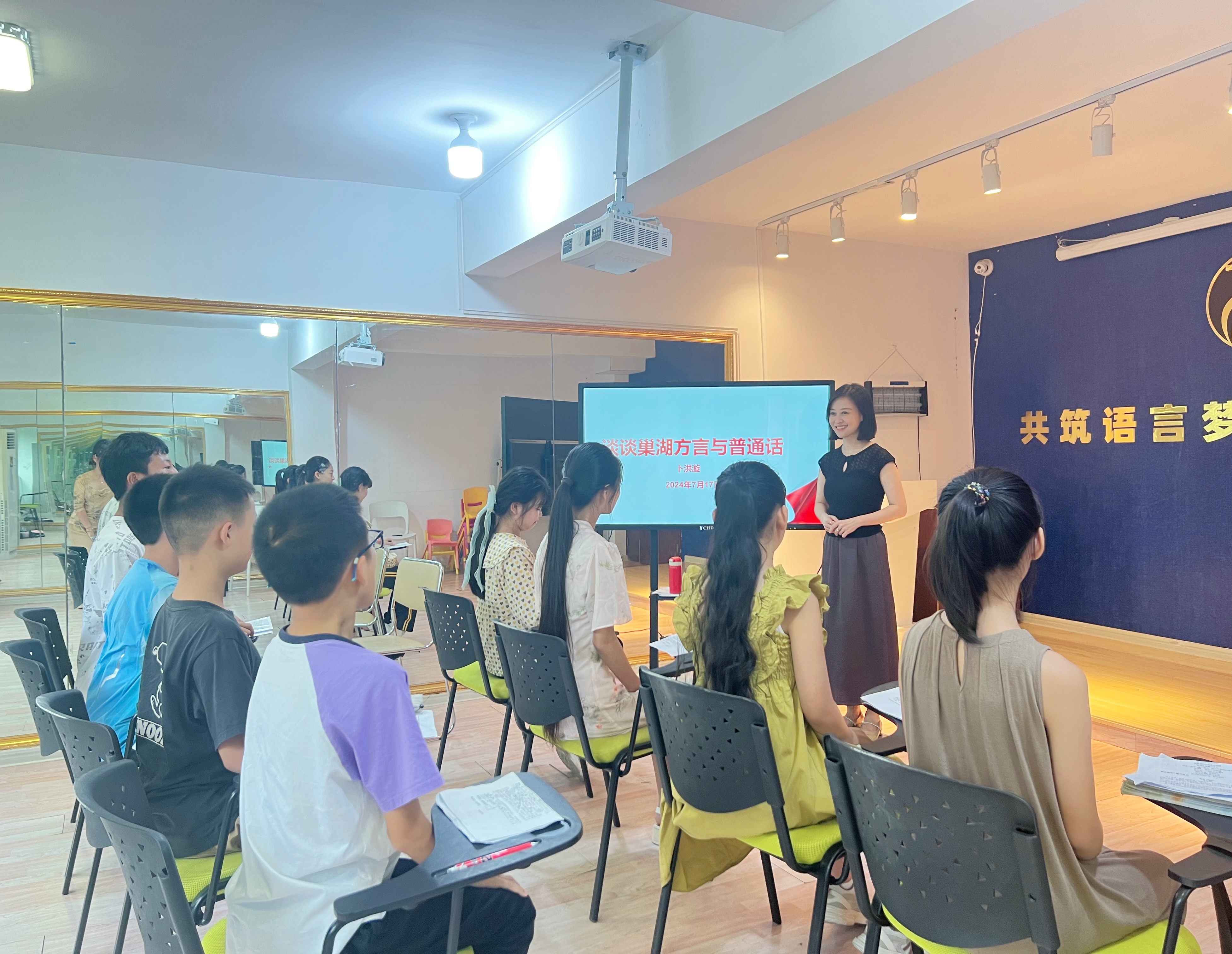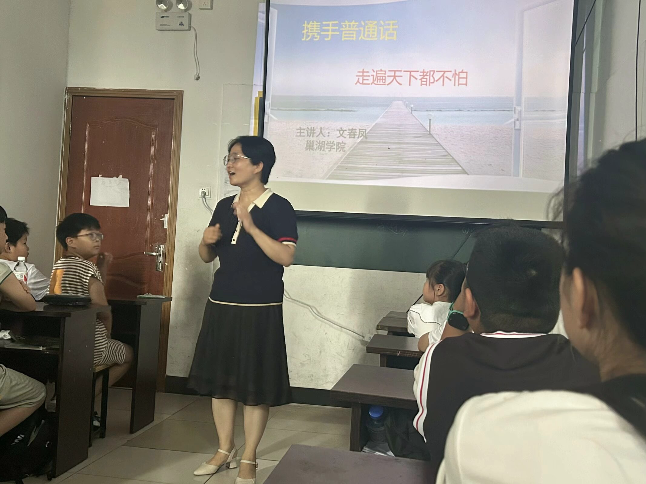 为深入了解巢湖方言与清溪镇方言的差异,7月17日,卜洪漩老师带领实践团来到巢湖市巢湖北路社区开展“巢湖方言与普通话”专题讲座。7月18日,实践团跟随安徽省普通话测试员文春凤老师来到清溪镇清溪社区开展了推普讲座。开展讲座旨在通过用专业且通俗易懂的知识介绍普通话展历程以及巢湖方言与普通话的差距,强调学习使用普通话的重要性。活动现场气氛活跃,小朋友们积极配合,主动回答问题。