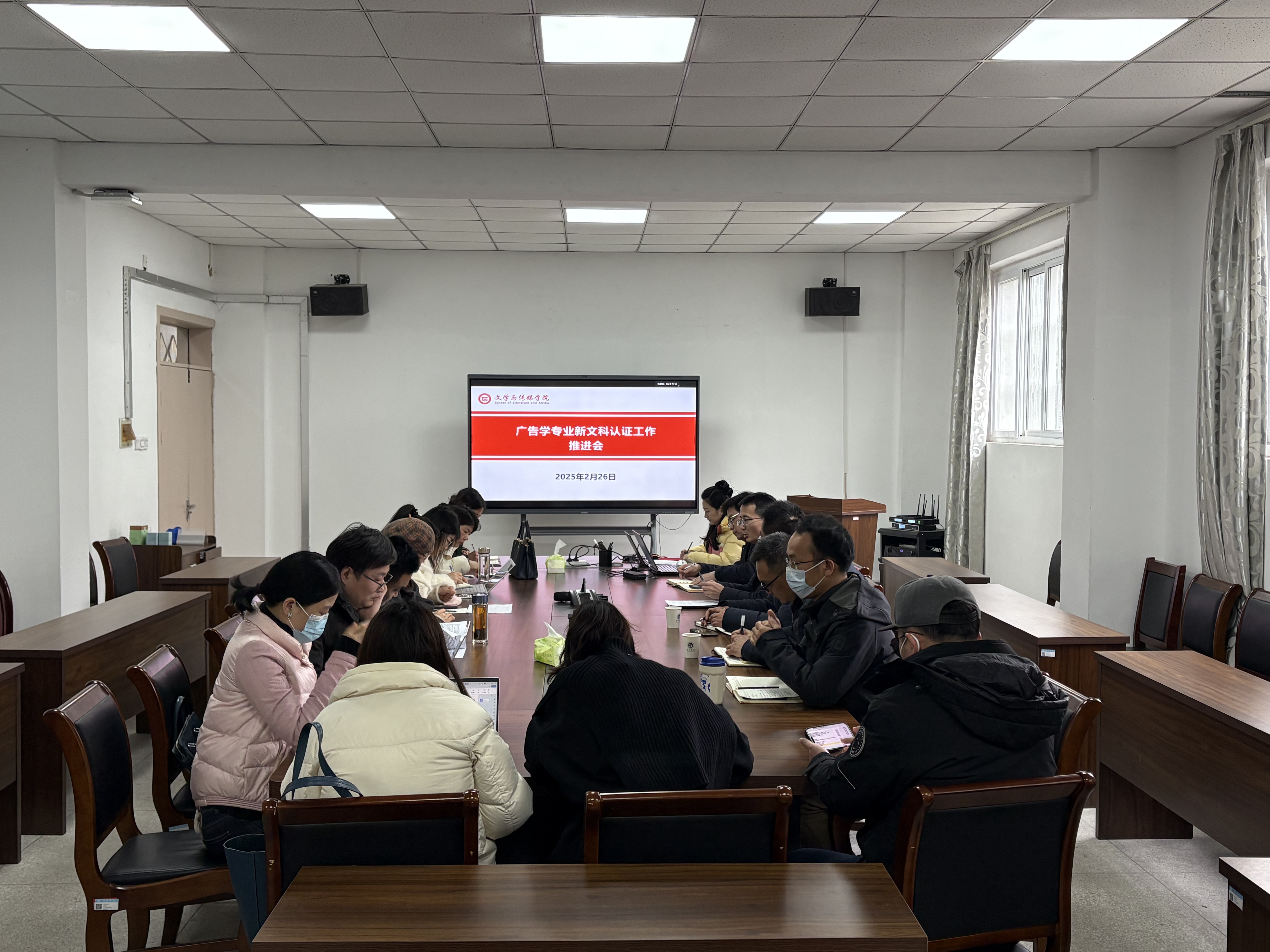 2月26日下午,文学与传媒学院在敏行楼会议室召开广告学专业长三角新文科认证工作推进会。教务处副处长邓方、专业建设科科长李明到会指导,学院党委副书记孙冰、副院长王宇明、广告系全体教职工和材料组相关教师参加,会议由院长彭正生主持。
