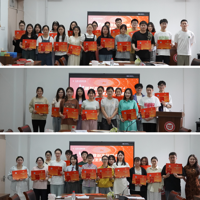 随后,各支部书记为毕业生党员颁发政治生日贺卡和纪念品。全体毕业生党员面向党旗重温入党誓词。