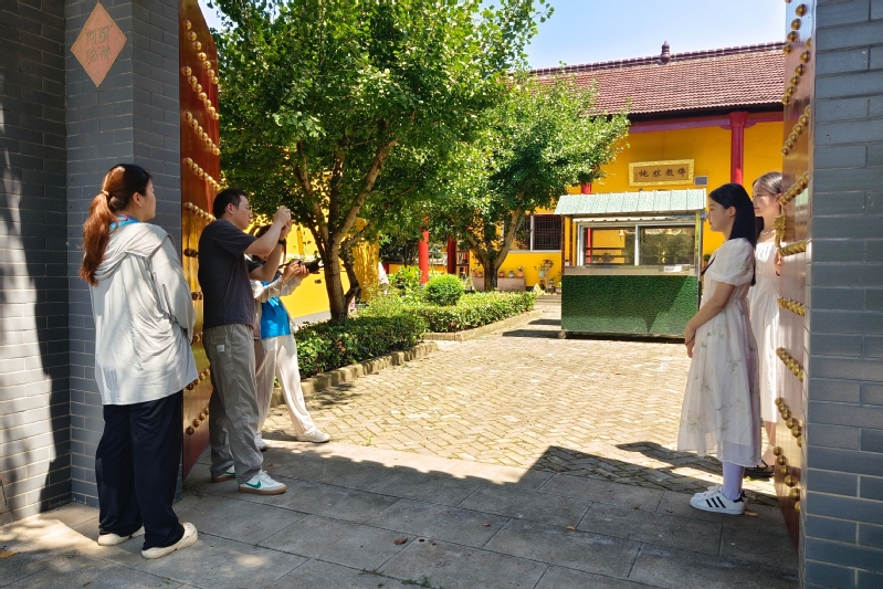 对接会后,团队成员开展实地探访。镜头先后对准侯村祠堂的飞檐斗拱、张大千父母墓的静谧氛围与宝塔寺的古朴风貌,用特写镜头记录石雕、碑文等文化符号;在蓝缘民宿,团队捕捉到庭院景观与民宿独特的教室风格,为后续民宿品牌宣传积累素材。