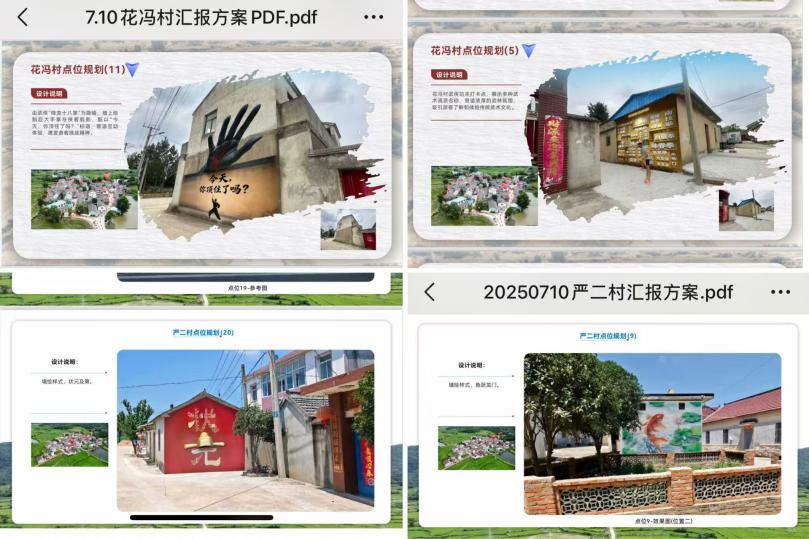 7月2日上午,团队首站抵达花冯村开展系统调研。通过走、看、听、问,运用专业影像采集器材,对村落空间布局、文化资源进行全方位诊断。调研发现,该村墙面和公共区域改造潜力显著,特别是丰富的民间故事和传统文化为后续设计提供了独特素材。