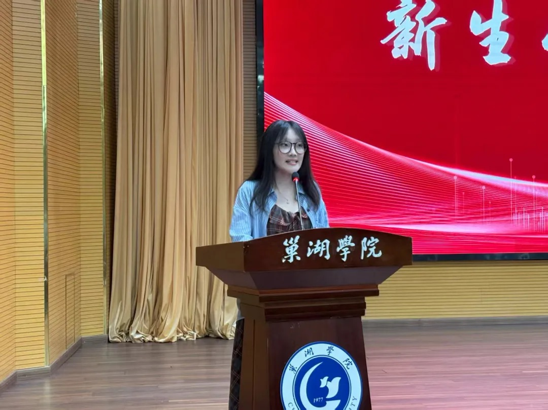 2025级汉语言文学专业王欣宇代表新生发言,表达了对自己大学生活的憧憬与规划。她表示将尽快适应新环境,专注学业、投身实践、持续进步,与同学们共同成长,努力成为有理想、有本领、有担当的巢院人。