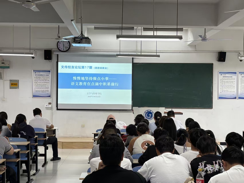 10月12日上午,文学与传媒学院第17期校友论坛在慎思楼北102教室举行。本次论坛特邀学院1998级汉语言文学专业优秀校友、现任巢湖市第一中学教师张隋全担任主讲,为2024级、2025级汉语言文学专业学生作了题为“慢慢地坚持做点小事”的专题讲座。论坛由学院副院长陈先涛主持。