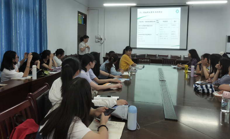 会议伊始,柯应根首先对李金云进行了简单的介绍,并对李金云的到来表示热烈欢迎。同时也告诉同学们,武汉科技大学是一所具有一级学科点的高校,地理位置优越,是一所值得考虑的高校。紧接着李金云对武汉科技大学的教学情况和师资力量进行了一个简要的介绍,其中着重介绍了武汉科技大学外国语学院硕士学位的建设历程。向同学们展示了武汉科技大的研究生培养特色、学术成果以及就业情况。同时李金云对研究生资助体系进行了讲解,并展示了一些招生的专业参考书目及专业学位。接着她和同学们分享了一部分武汉科技大学近年来的考试真题,并举例对历年来的招生情况进行了简要的分析。