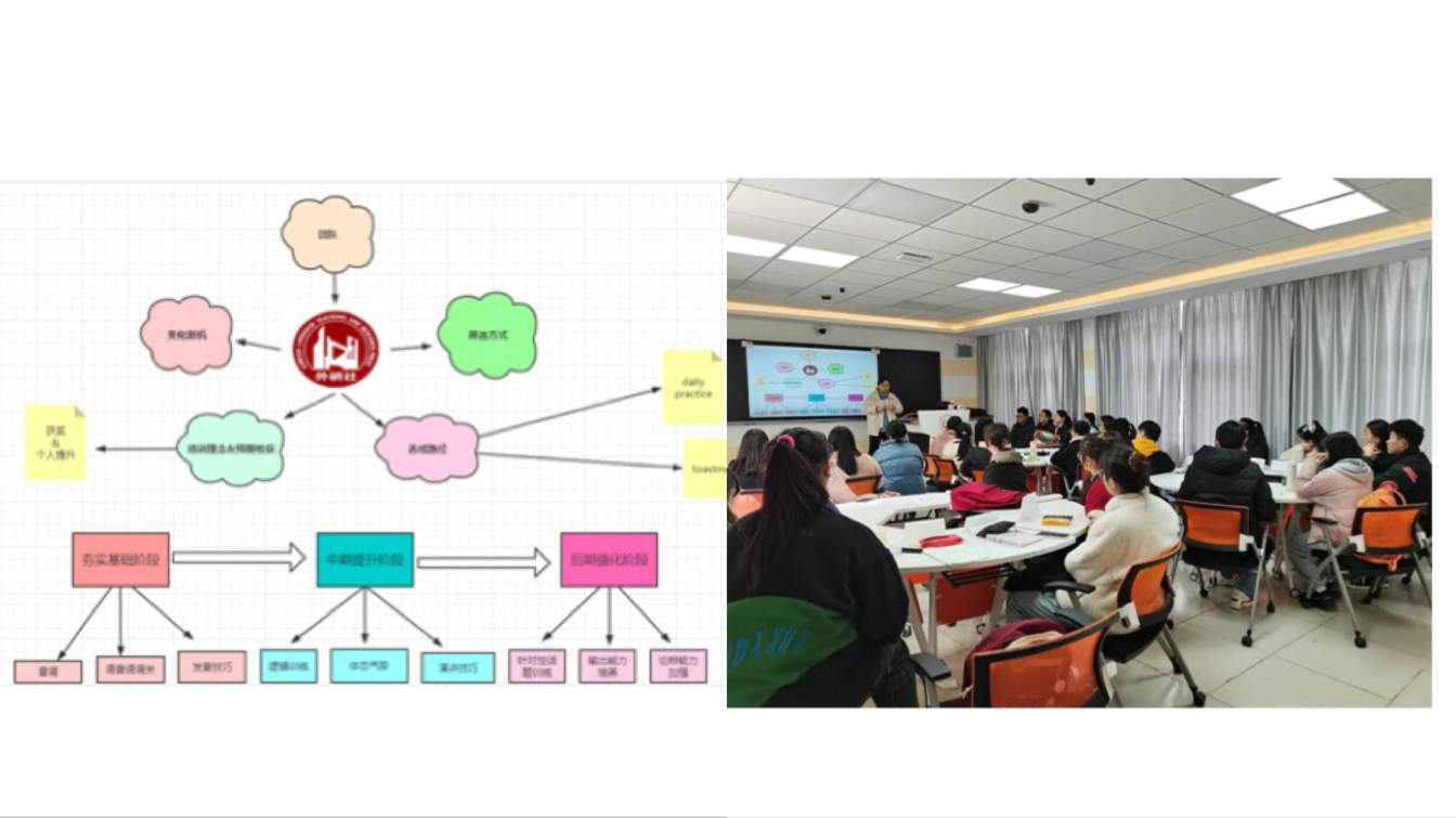 接下来,指导教师团队依次和学生进行了经验心得分享。聂勇伟老师指导过两届英语演讲比赛,是位经验丰富的金牌教练。自带气场的聂老师操着流利的英语口语和大家进行了英语学习经验的分享。他鼓励学生首先要克服胆怯的心理,不要惧怕losing face;第二,要多加练习,一定要有高质量的输入;第三要加强语块、语段的整体储存积累,多背诵优秀范文;第四,要在愉快中学习;第五,一定要坚持到底。