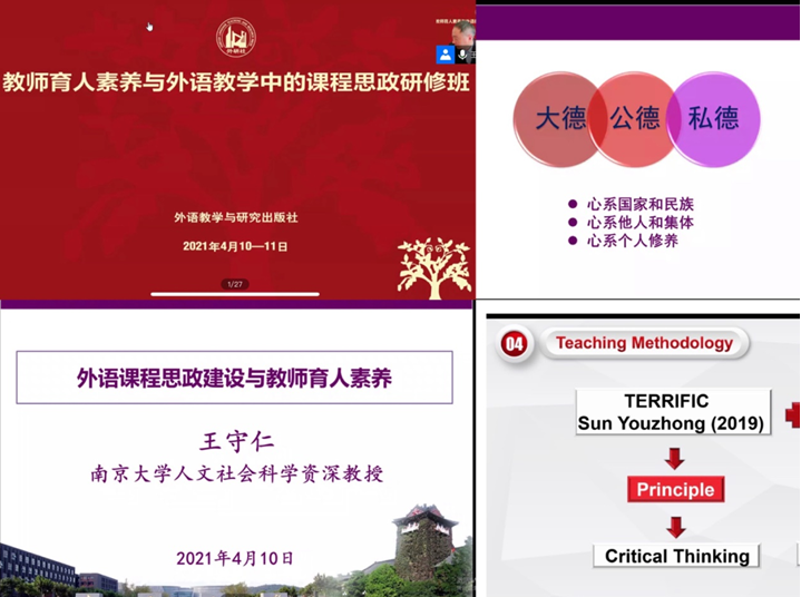 外语教学与研究出版社于2021年4月10—11日举办“教师育人素养与外语教学中的课程思政”线上研修班。南京大学王守仁教授、北京外国语大学张虹副教授、山东师范大学韩冰老师与陈琳琳老师担任主讲。全国近300位教师同聚线上,我院大学英语(二)教研室主任王钢、商务英语教研室高洁参加了培训。